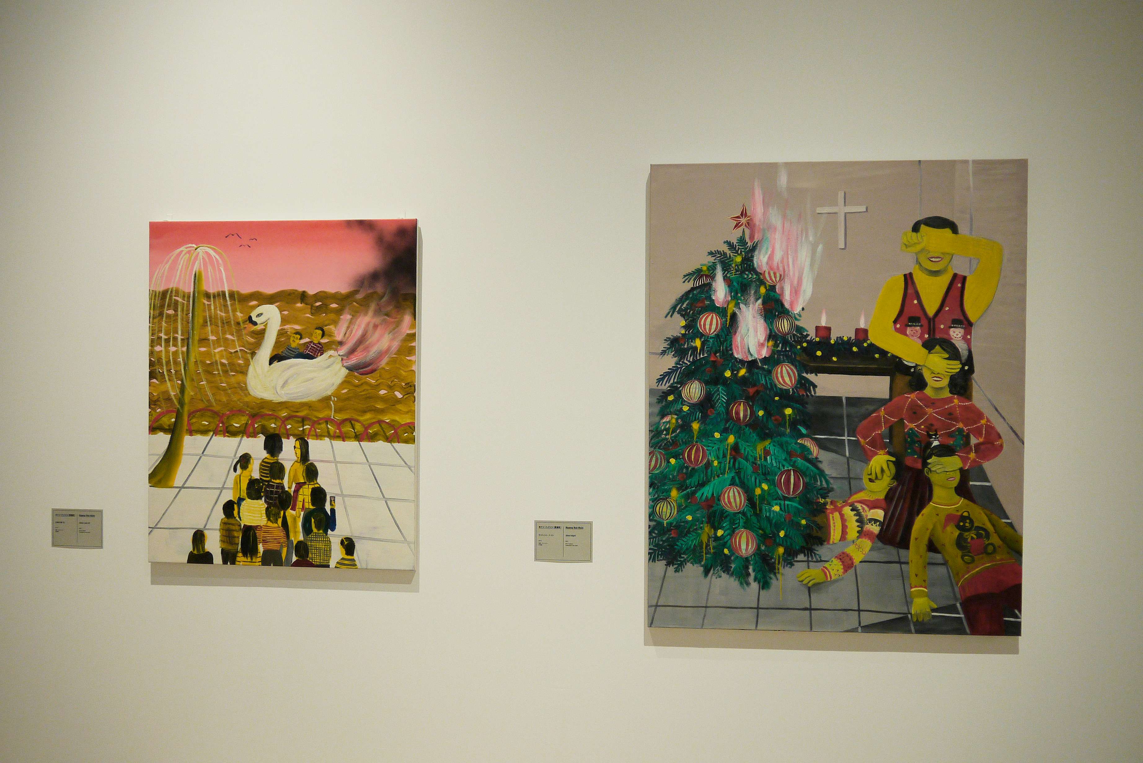 展示風景より。左から黄海欣《白鳥の湖》(2015)、《サイレント・ナイト》(2013)