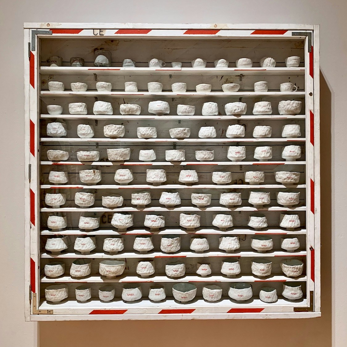 トム・サックスのアイコニックな作品である、「不完全な美」を体現した「NASA」のロゴ入り茶碗。ここではその起源となった作品《First Tea on Mars》(2015)も展示されている。自作ではなく、ebayで購入した茶碗を素材にしたこの作品は、トム・サックスにとっては「失敗作」。しかしトム・サックスは「私は過去の失敗を展示することを恐れてはいません」と語る。「なぜなら、失敗しなければ学ぶこともできないのですから」。