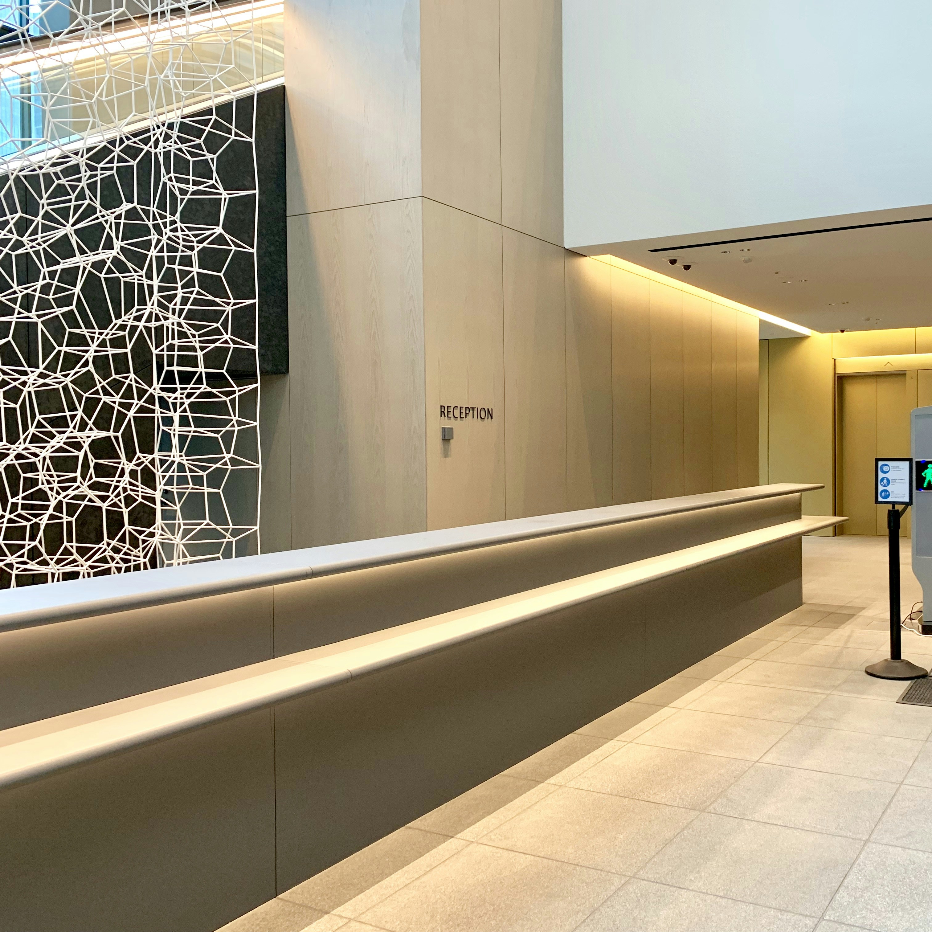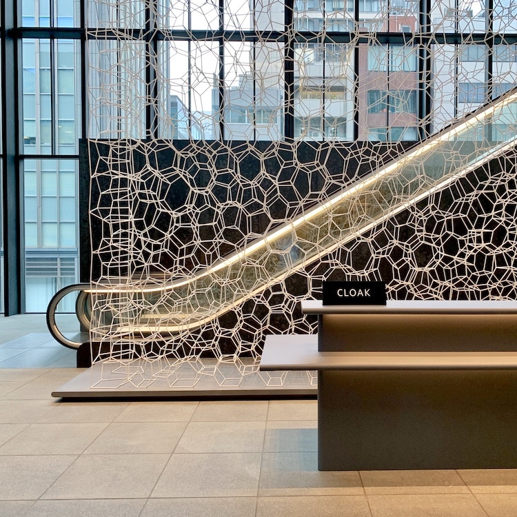 正面入口は、これまでの八重洲通り側からメインストリートである中央通り側に移動。1~2階は高さ8メートルもの高透過大型ガラスで囲まれており、開放感ある空間を実現した。また、1階カフェ部分の9枚の大型ガラスは電動回転扉となっており、内外をつなぐオープンカフェとして街に開かれたものとなる。また展示室への入口となる3階にも、5階までを貫く高さ16.5メートルもの吹き抜けがあり、アーティゾン美術館は外光あふれる館と言えるだろう。