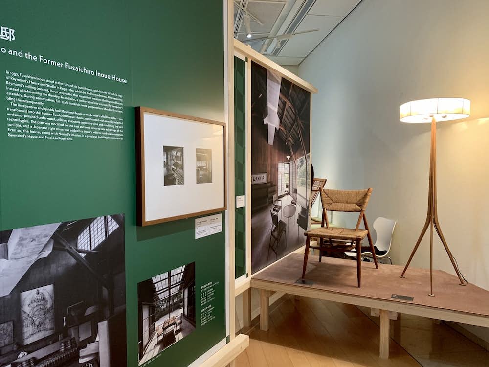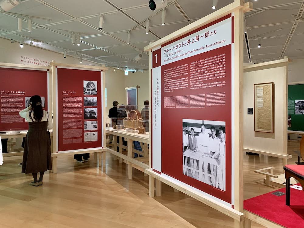 「ミラテス」の包装紙や看板なども展示されている。奥に見えるのはタウトがデザインした椅子