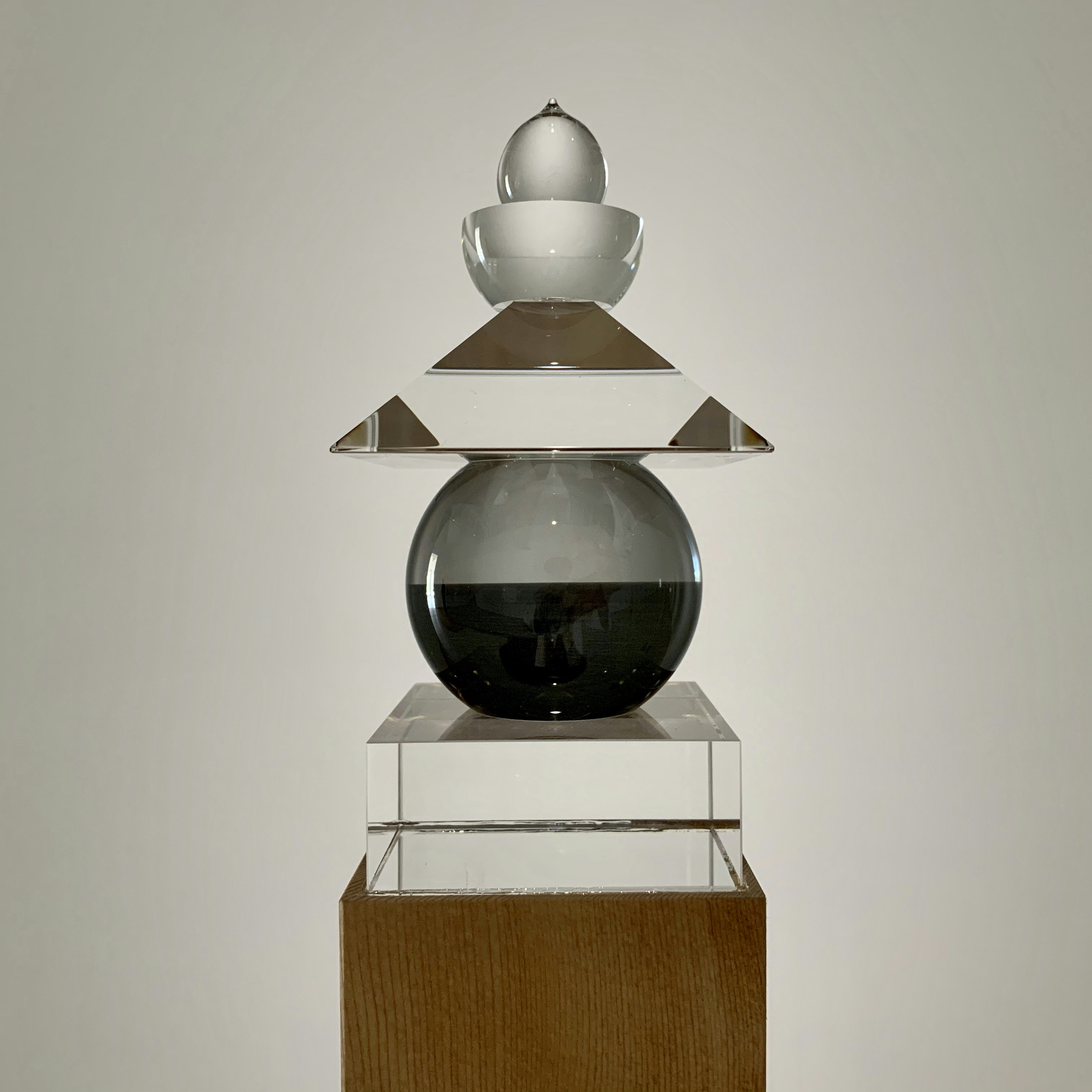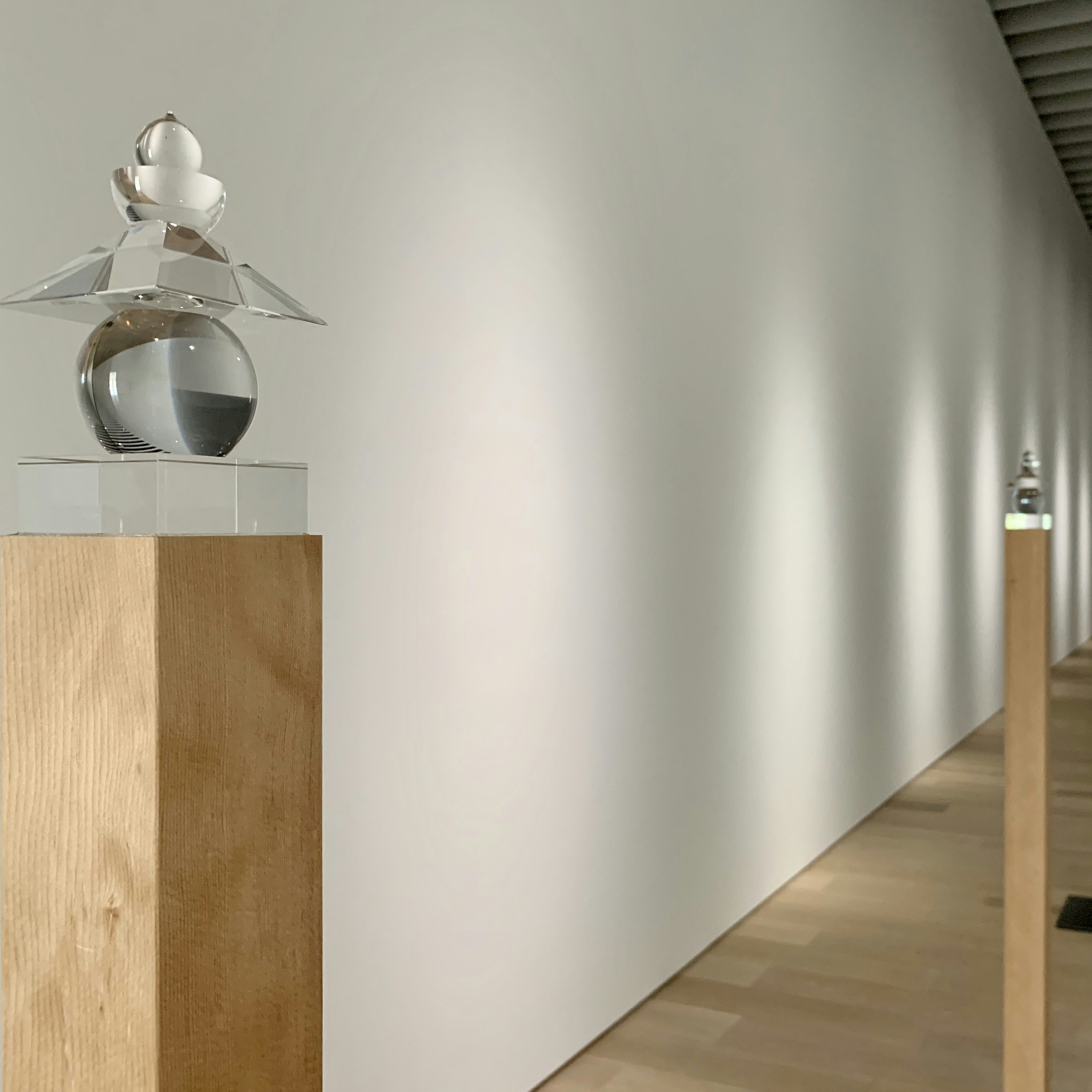 展示室は、世界各地の「海景」を封じ込めた「光学硝子五輪塔」の参道から始まる。仏教教典のなかで、世界の構成要素である五大要素(地水火風空)を抽象化し、発展したという五輪塔のかたち。これが13基も一列に並ぶ様は圧巻だ。