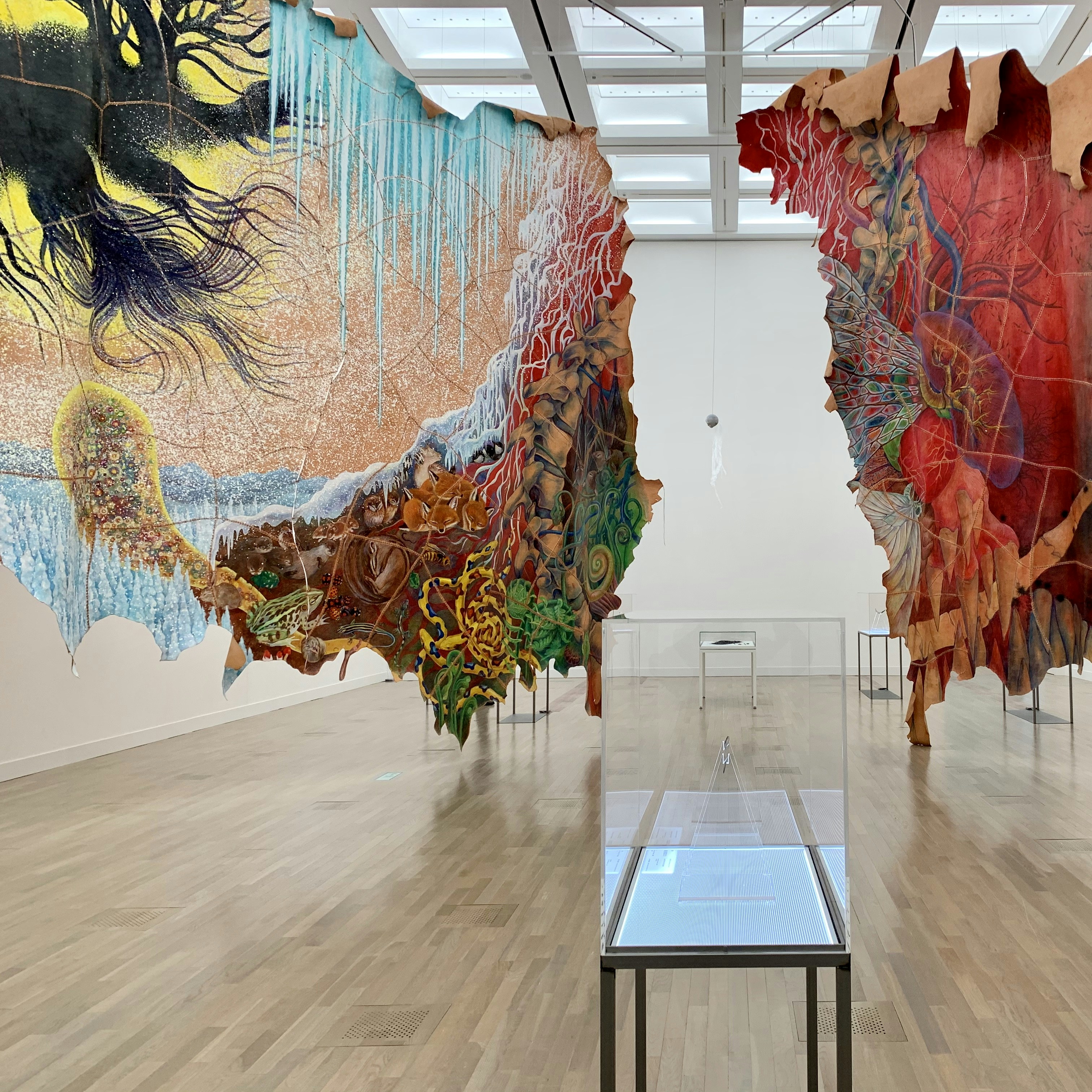 巨大な展示室いっぱいに広がる《皮緞帳》(2015)で圧倒的な存在感を示すのは、鴻池朋子。鴻池は今回、本来は1枚続きで展示される同作をふたつに分け、中央に間を設けた。牛革でできた《皮緞帳》の間には、銀色の振り子が揺れる。