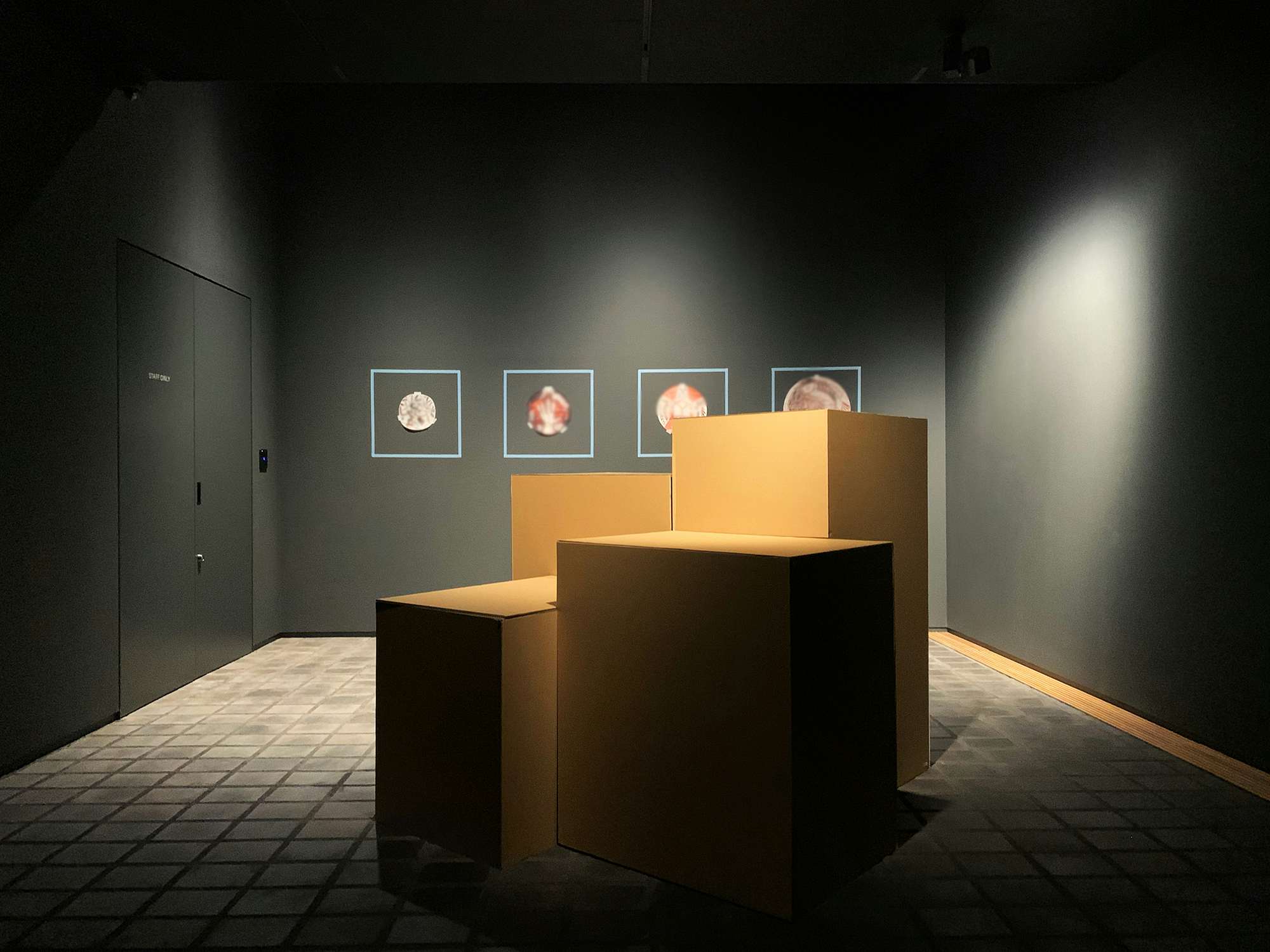 モックアップで展示台を検討中の、地下1階にある展示室のひとつ