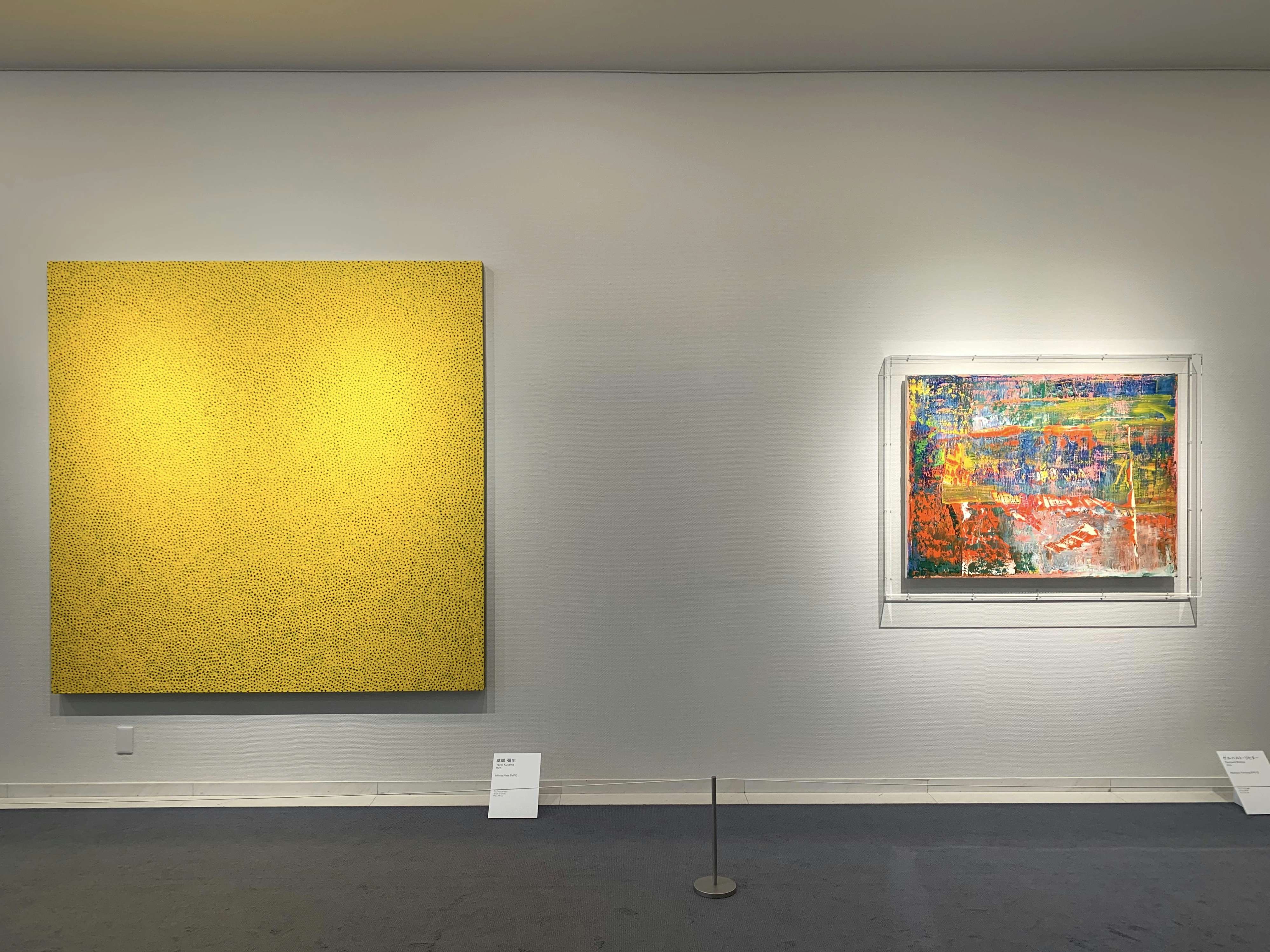 展示風景より、左から草間彌生《Infinity Nets TMPQ》(2012)、ゲルハルト・リヒター《Abstract Painting(940−3)》(2015)