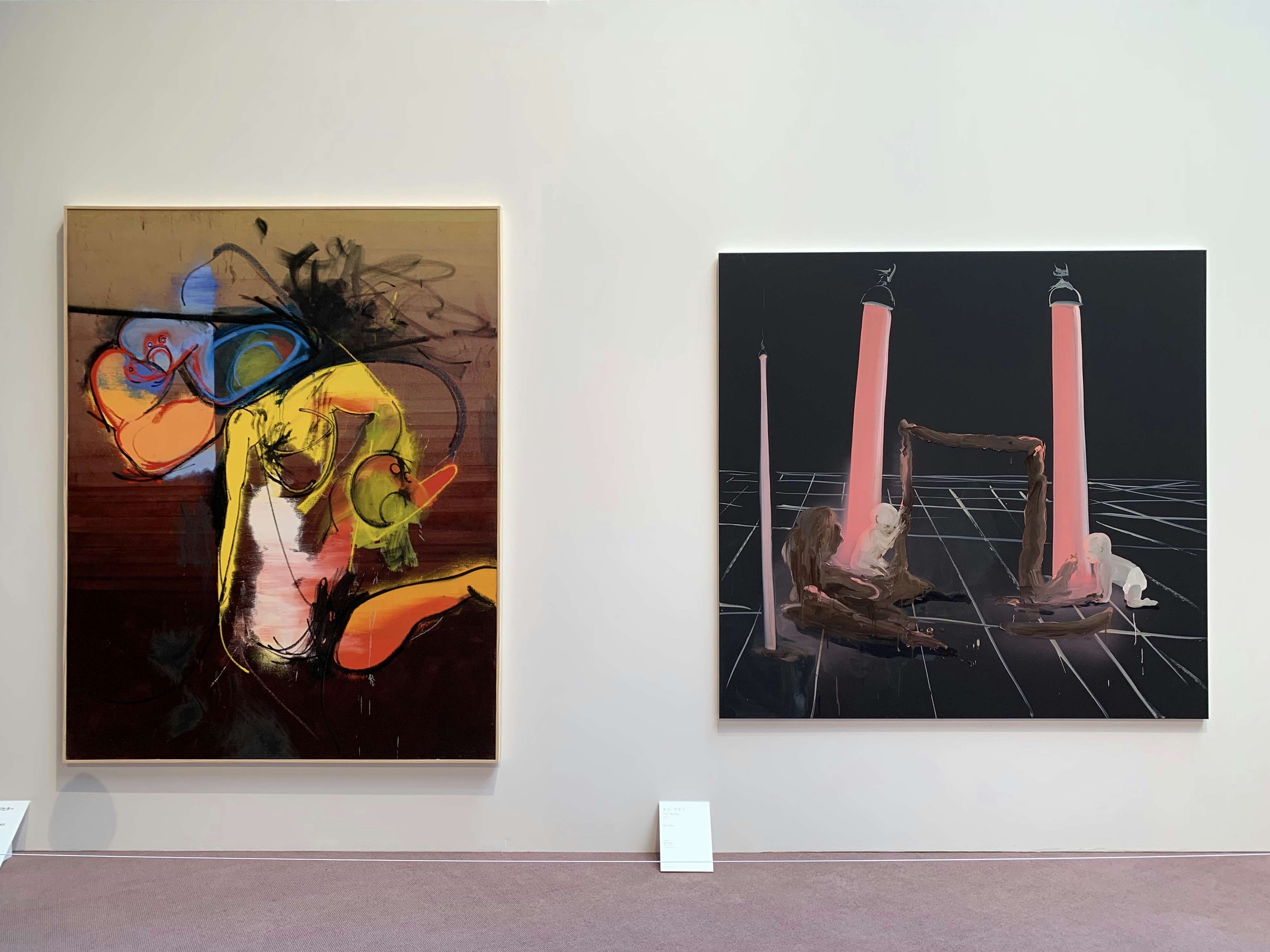 展示風景より、左からダニエル・リヒター《I HAD A NICE DOG ONCE》(2019)、タラ・マダニ《Shit Mom》(2019)