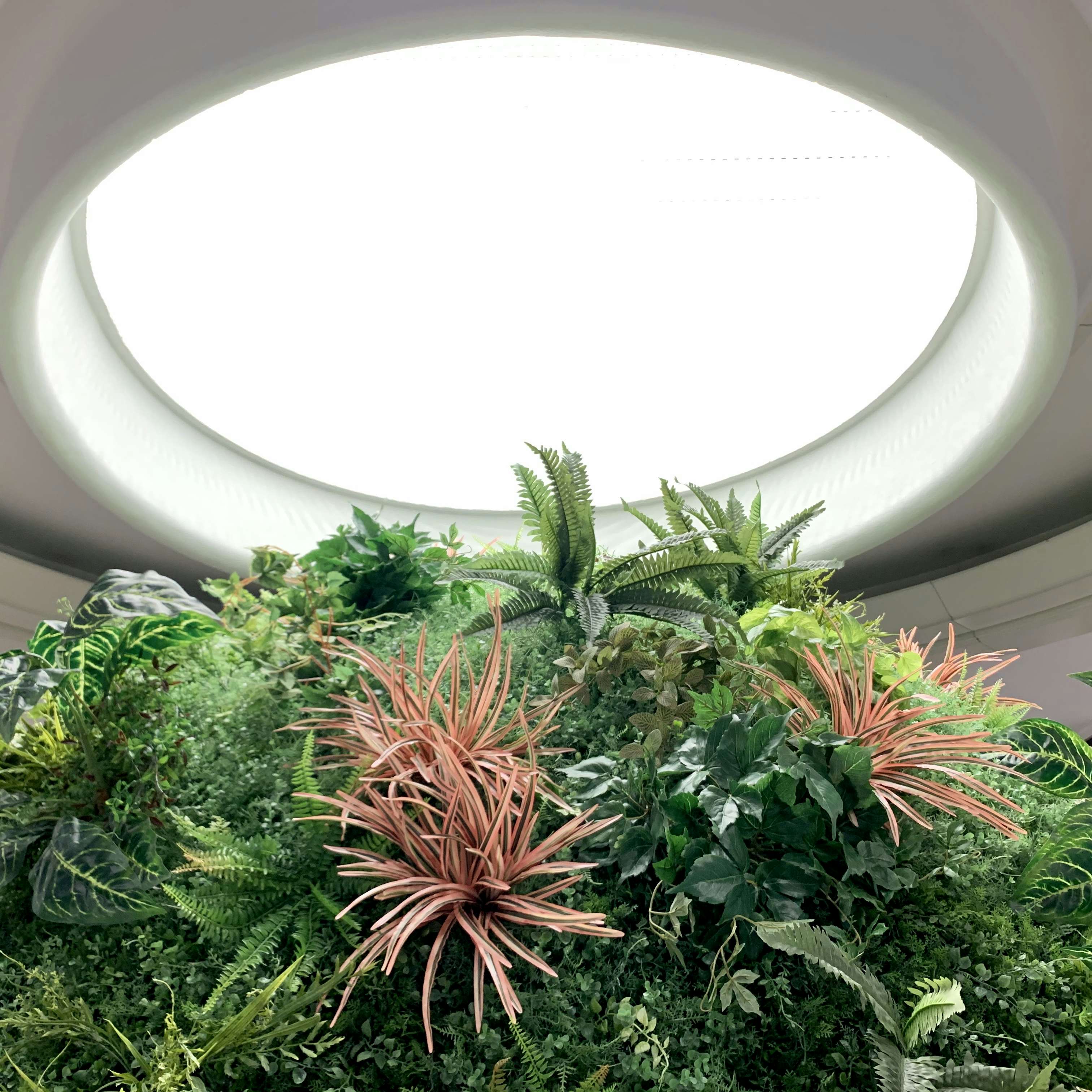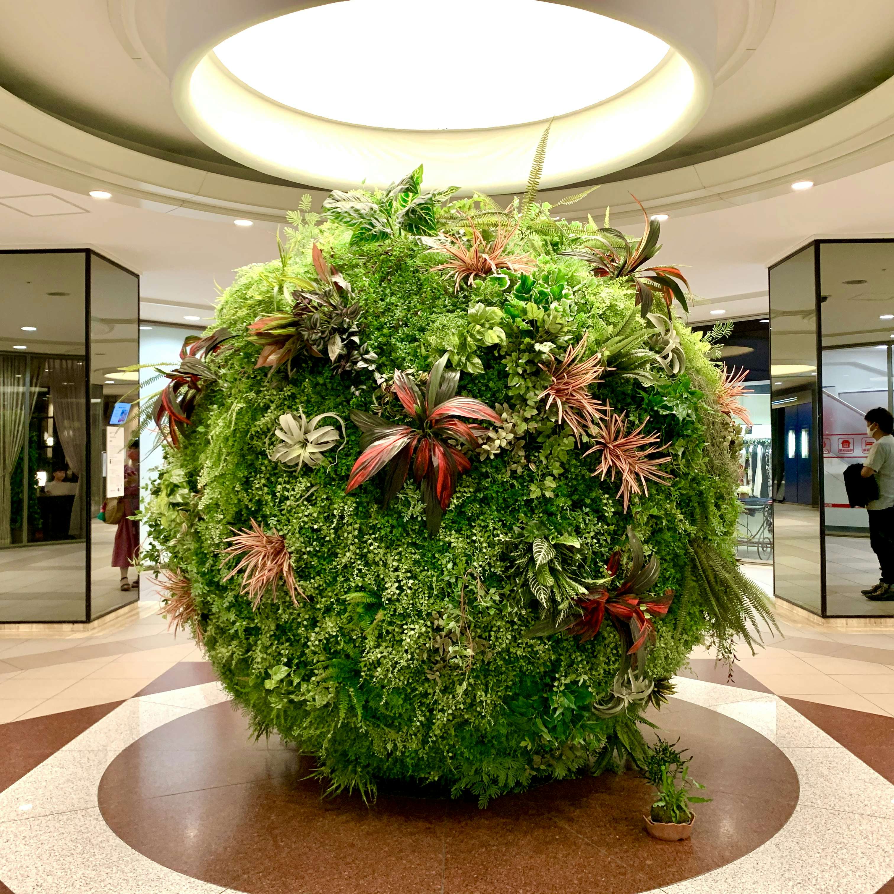ミラノを拠点に活動し、今年アーツ前橋で個展 「地球はレモンのように⻘い」を開催したばかりの廣瀬。新有楽町ビルでは、同展のために制作された作品《フォレスト・ボール》を展示した。直径2.5メートルの球体の作品は、森のように⼈⼯植物(造花)によって覆われており、“⼈⼯”でできた“⾃然”というふたつの相反するものが、球体という地球や宇宙を想起させるかたちをつくる。「両義性」をコンセプトにしたこの作品で、廣瀬は“⼈⼯”や“⾃然”という概念を改めて問い直し、意味を転倒させることで新たな想像が広がることを狙う。