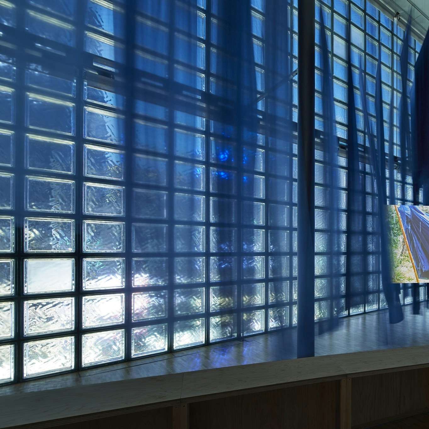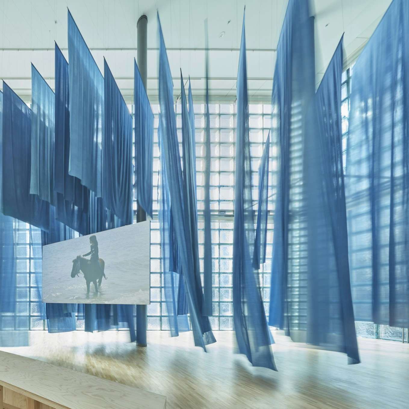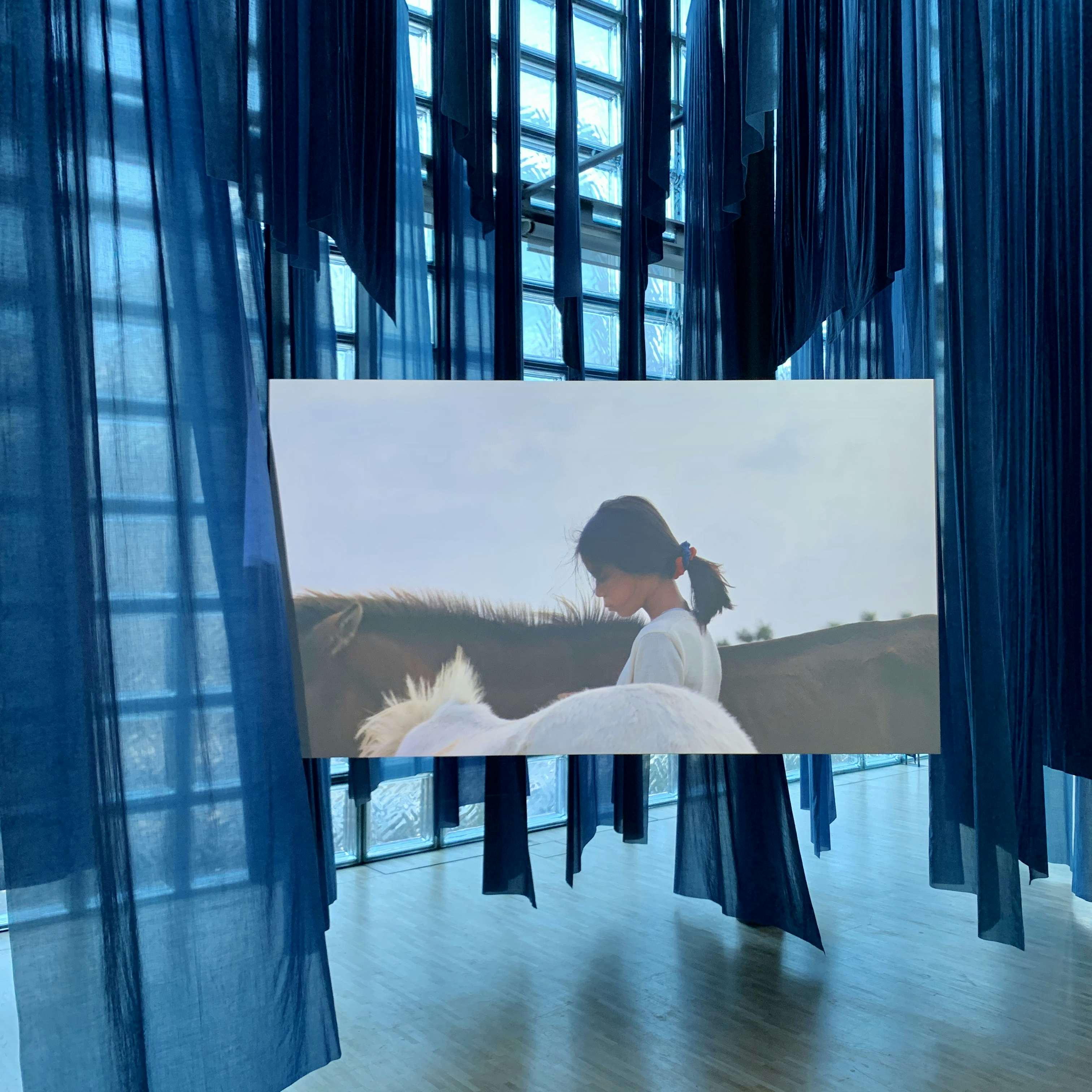 このふたつの映像作品には、テキスタイルデザイナー・キッタユウコが関わっている。《潮》では本展のために36枚の琉球藍で染められたテキスタイルが同名のインスタレーションとして展示。《潮》の映像のなかに登場するうららの帯や、《依代》の馬の衣装もキッタが手がけた。