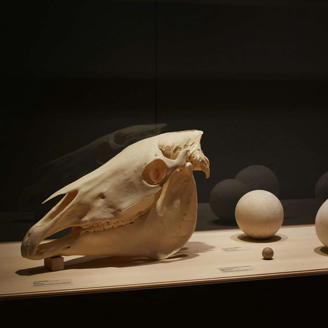 本展タイトルにある「ベゾアール」は、動物の胃や腸の中に形成される凝固物のこと。現在では科学的に証明できる存在だが、古来ではお守りや神秘的な想像と結びつけらることもあったという。ベゾアールは動物体内の水分不足によって急速に成長し、巨大化する。生命と直結する水分の不足とベゾアール。これを手がかりとし、本展では馬と関連する品々や資料や馬の撮影を通じ、生の儚さを伝える。