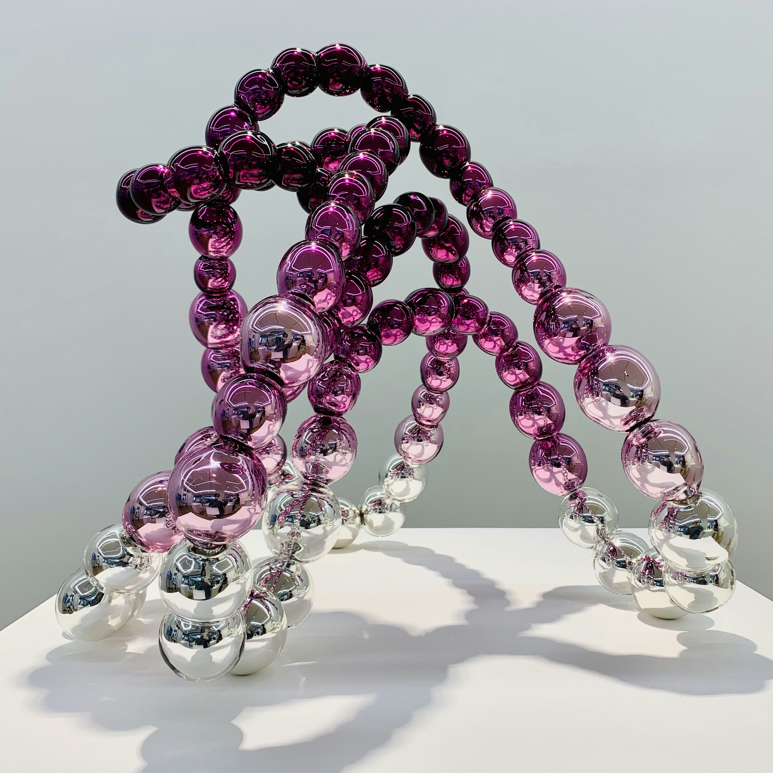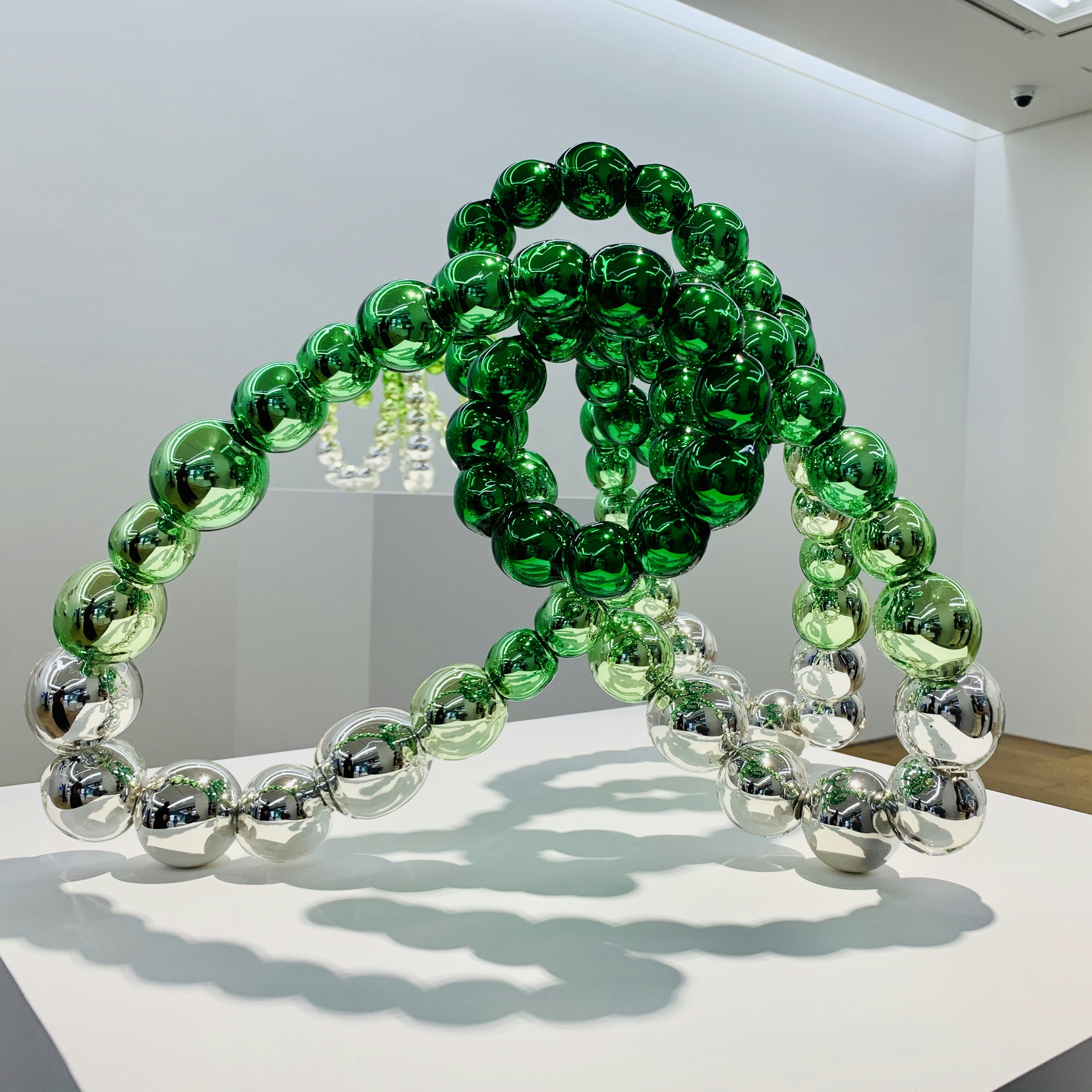 「Kiku」シリーズは菊の花の形状を抽象化したものであり、色も菊の花に着想を得た。作品は一筆書きのようにガラスピースがつながっており、覗き込めば鑑賞者や周囲の風景とともに、その作品自体をも映し出す。「永遠が重要なコンセプトなのです。この形状は、エネルギーが終わることなく続いていくことを意味しています」。