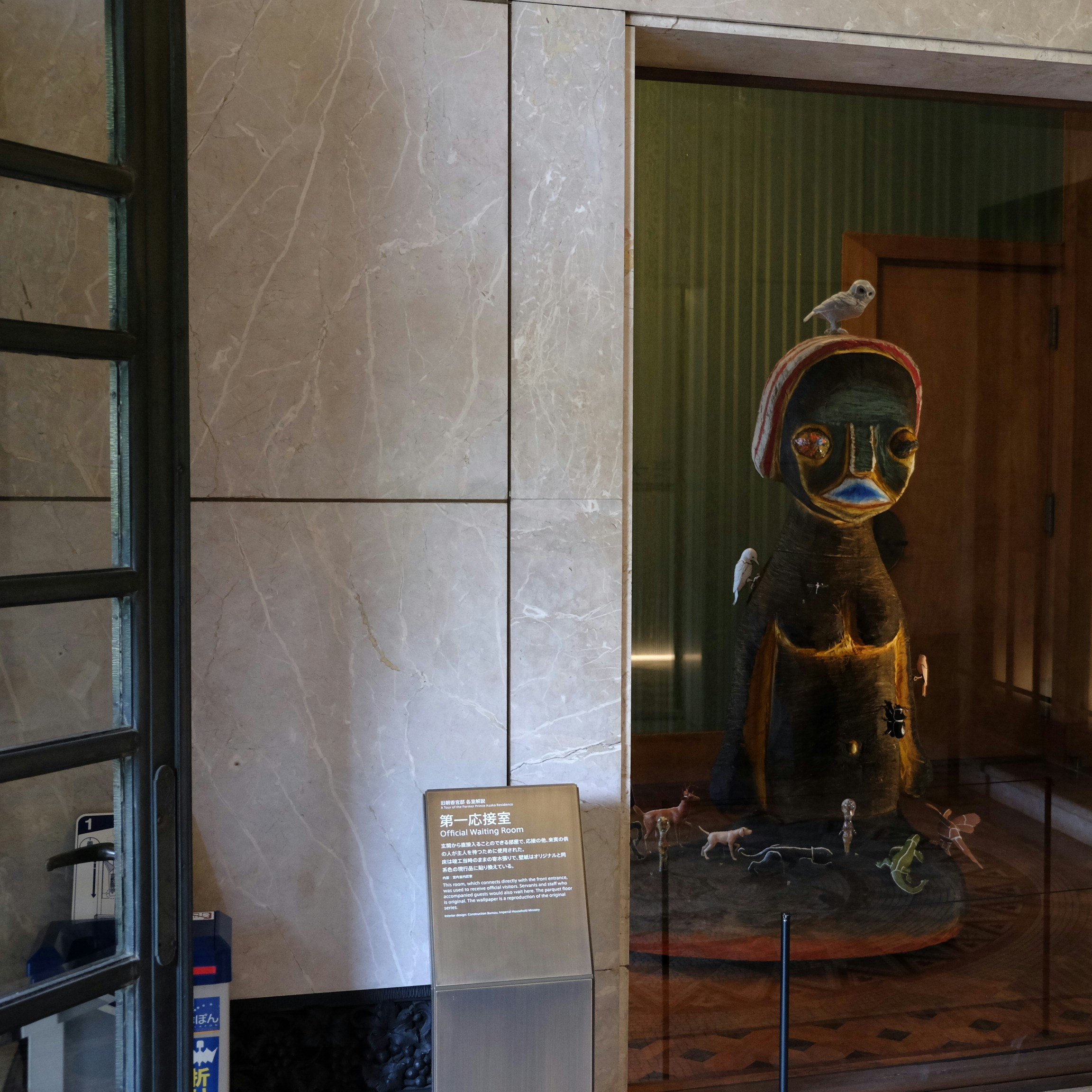 まず、玄関前の狛犬の横では来場者を出迎えるのが、胎児のような「人型」をモチーフに絵画や彫刻を制作し続けてきた加藤泉の、石を使った小さな作品だ。さらに玄関横の第一応接室にも加藤の大型の立体作品が展示されており、足を踏み入れただけでも、いつもの東京都庭園美術館とは異なる表情を見ることができる。