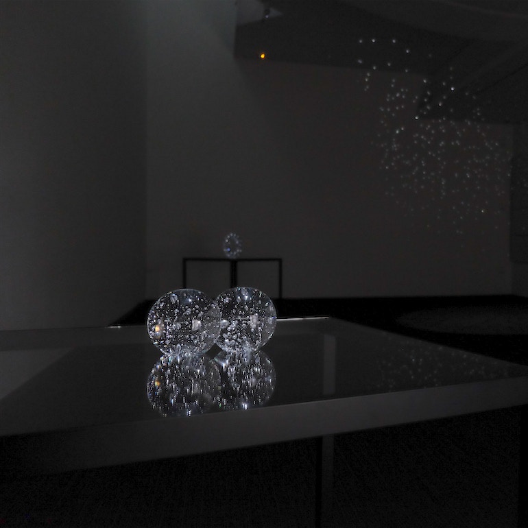 また、新館で展開される《光に始まる 光に還る》(2020)は、暗い空間のなかにガラス玉を浮かべたり、並べられたりしながら光と影をかたちづくったインスタレーション。鑑賞者は室内を回りながら、それぞれのガラス玉に多様な関係性を見出すことになるだろう。