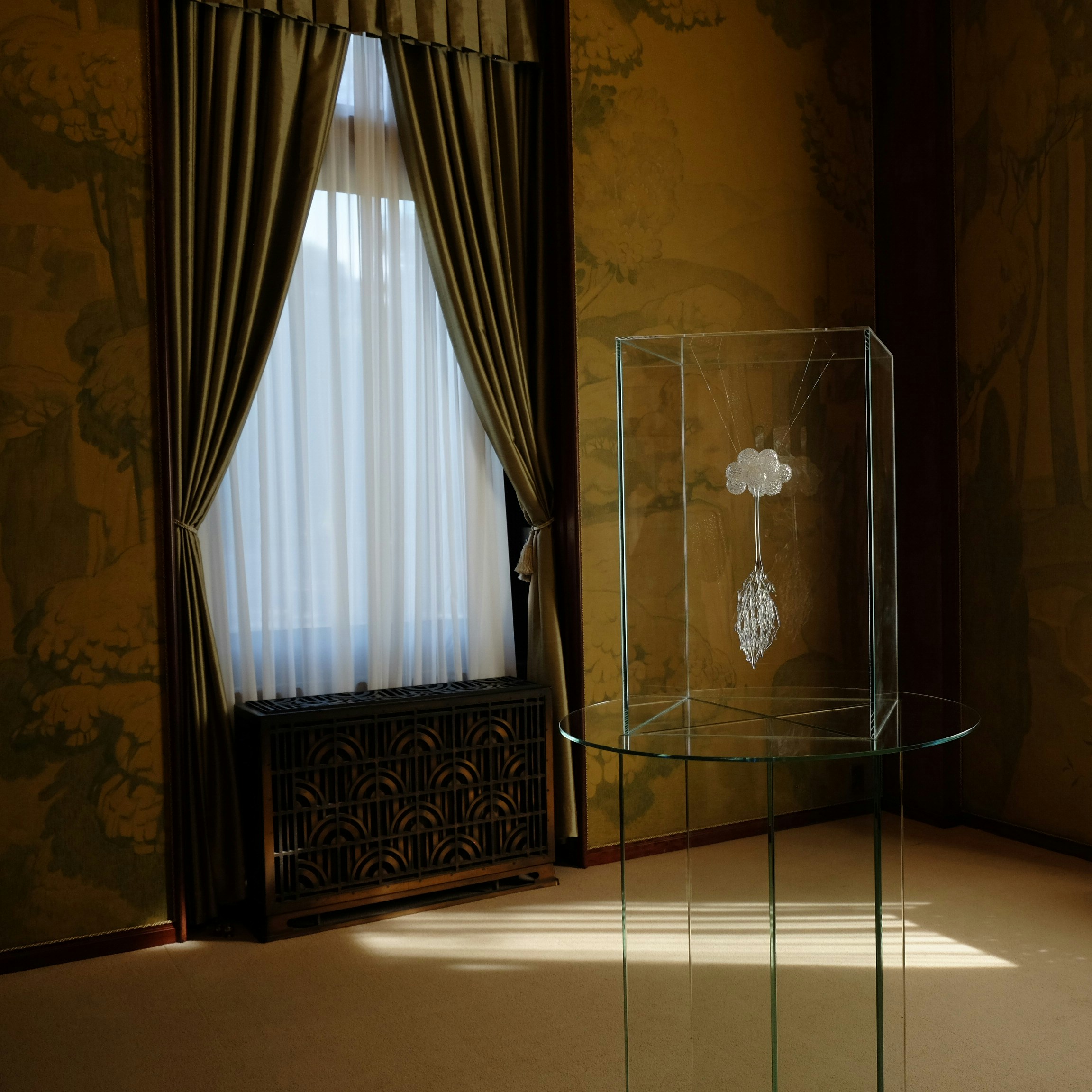透明なガラスを使用した作品で、見えない世界との関係を問い続けてきた青木美歌。青木が朝香宮妃殿下の居間を舞台に、ガラス作品を家具とともに展開した作品が《光に始まる 光に還る―A room of hidden People》(2020)だ。かつてそこに居た人々への思いを喚起させるように、透明な作品群が輝く。
