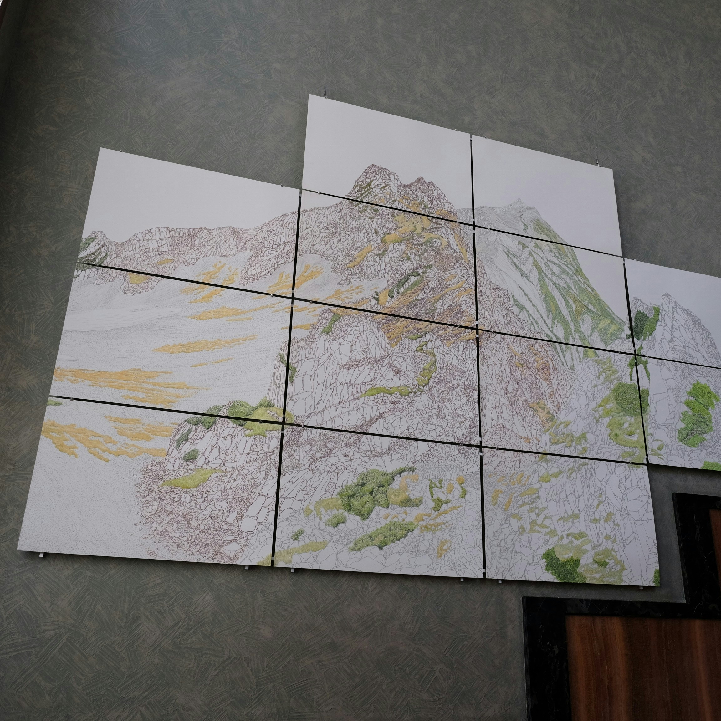 朝香宮殿下の寝室では、砂漠の植物を模した「Cosmic Cactus」シリーズを展開。小さな寝室のなかに、日本では見られないような風景を擬似的に生み出した。また、若宮寝室の《Panoramic Forest, Panoramic Lake》(2012)は、森と湖を俯瞰するパノラマの風景を、スチレンボード上にクレヨンとオイルパステルで描き出した作品。かつて寝室であったふたつの部屋が、康の手で風景と対峙する空間につくり変えられている。