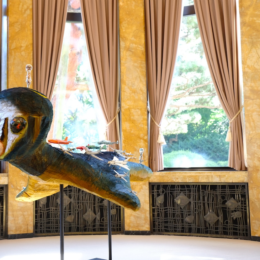 今年2月に逝去した康夏奈は、小豆島を拠点に当地の植物や石などの素材も使いながら、海や宇宙といった自然の広い空間をモチーフに制作を続けてきた。康は、朝香宮殿下と若宮、それぞれの寝室だった部屋でも作品を展示している。