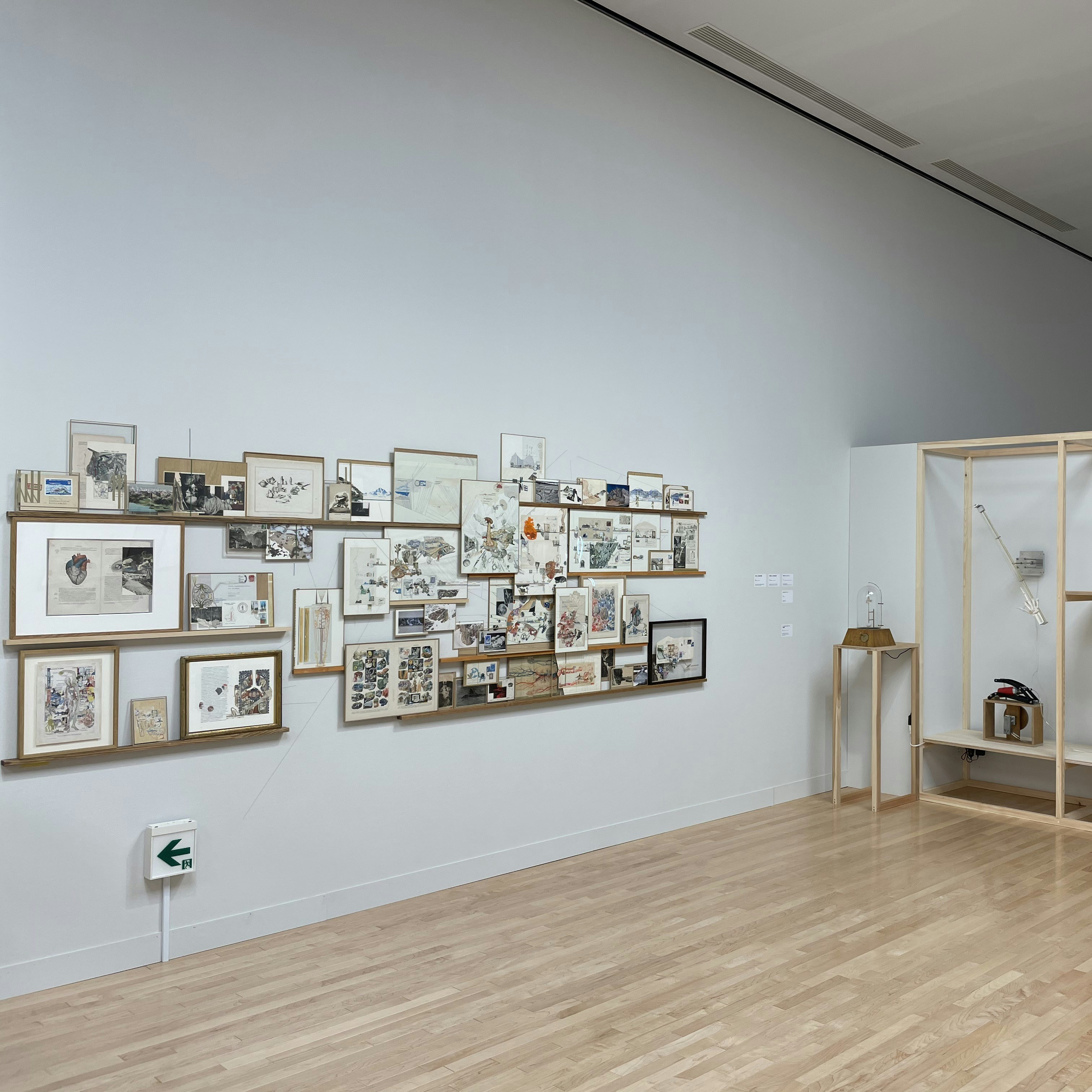 展示室1では、片岡+岩竹は展示空間をひとつの装置として見立てた。片岡が手がけた、日用品に重力や磁力などの物理的なエネルギーを加えて動きを見せるインスタレーション作品や、岩竹が博物辞典や切手などの断片を組み合わせ、コラージュや写真などの手法で制作した平面作品を展示している。