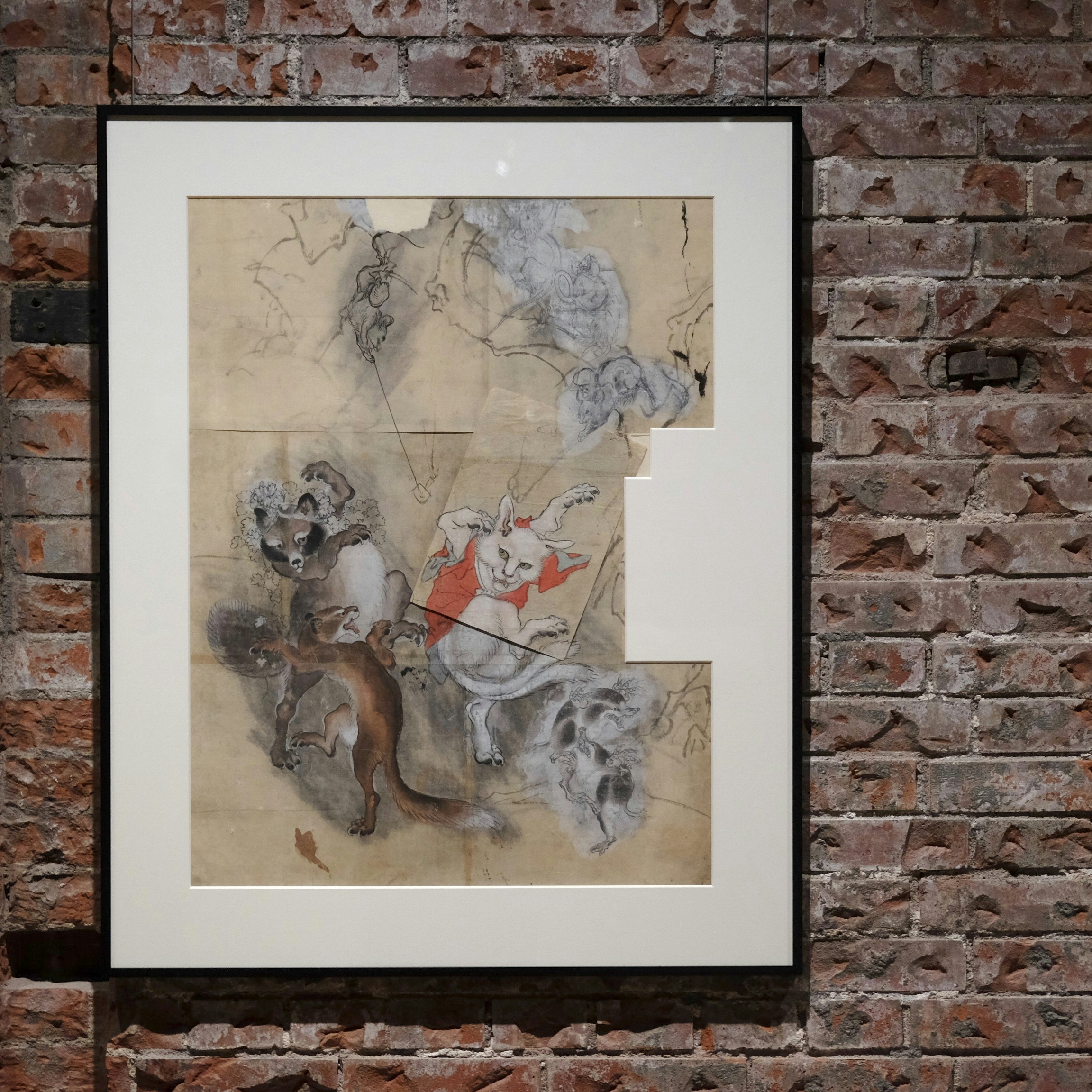 《鳥獣戯画 猫又と狸 下絵》と《鳥獣戯画 梟と狸の祭礼行列 下絵》(ともに制作年不詳)は、河鍋暁斎記念美術館の人気作品だ。最近の研究で《鳥獣戯画 猫又と狸 下絵》断片につながる下絵が存在することがわかり、この下絵を重ねることで、踊る猫又の顔を鼠が棒の先の蝋燭で照らしていることがわかった。歌舞伎の演出を想起させるこの発見は、下絵に新たな解釈を与えている。