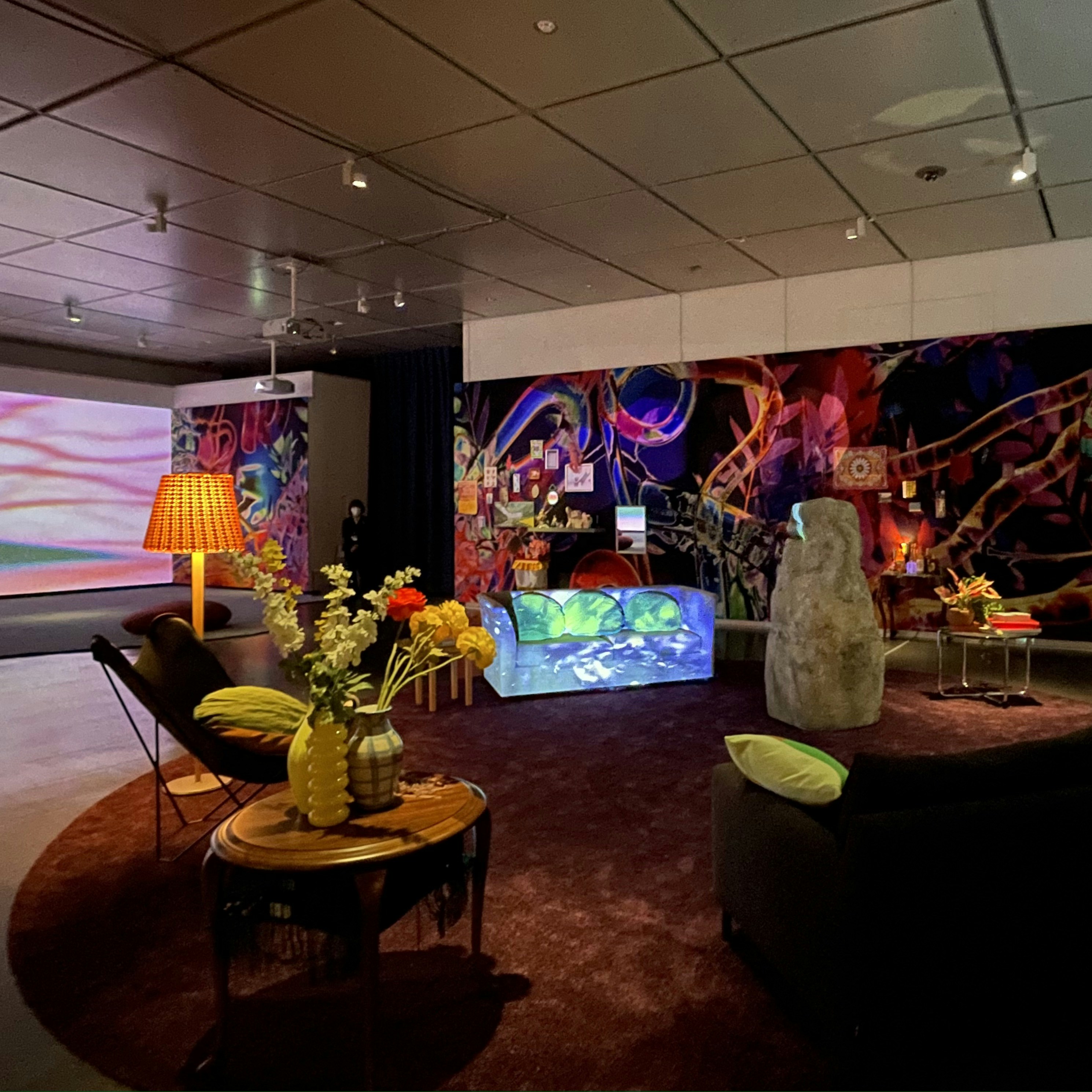 本展の最後の展示室はこのようなひとつのアパートメント・インスタレーションとなっており、鑑賞者はソファやベッドに体をもたせ、作品のなかに没入して体験することが促されている。作品のなかを歩き回る鑑賞者の体がスクリーンとなり、身体の介入によって映像が無限に変化していく。
