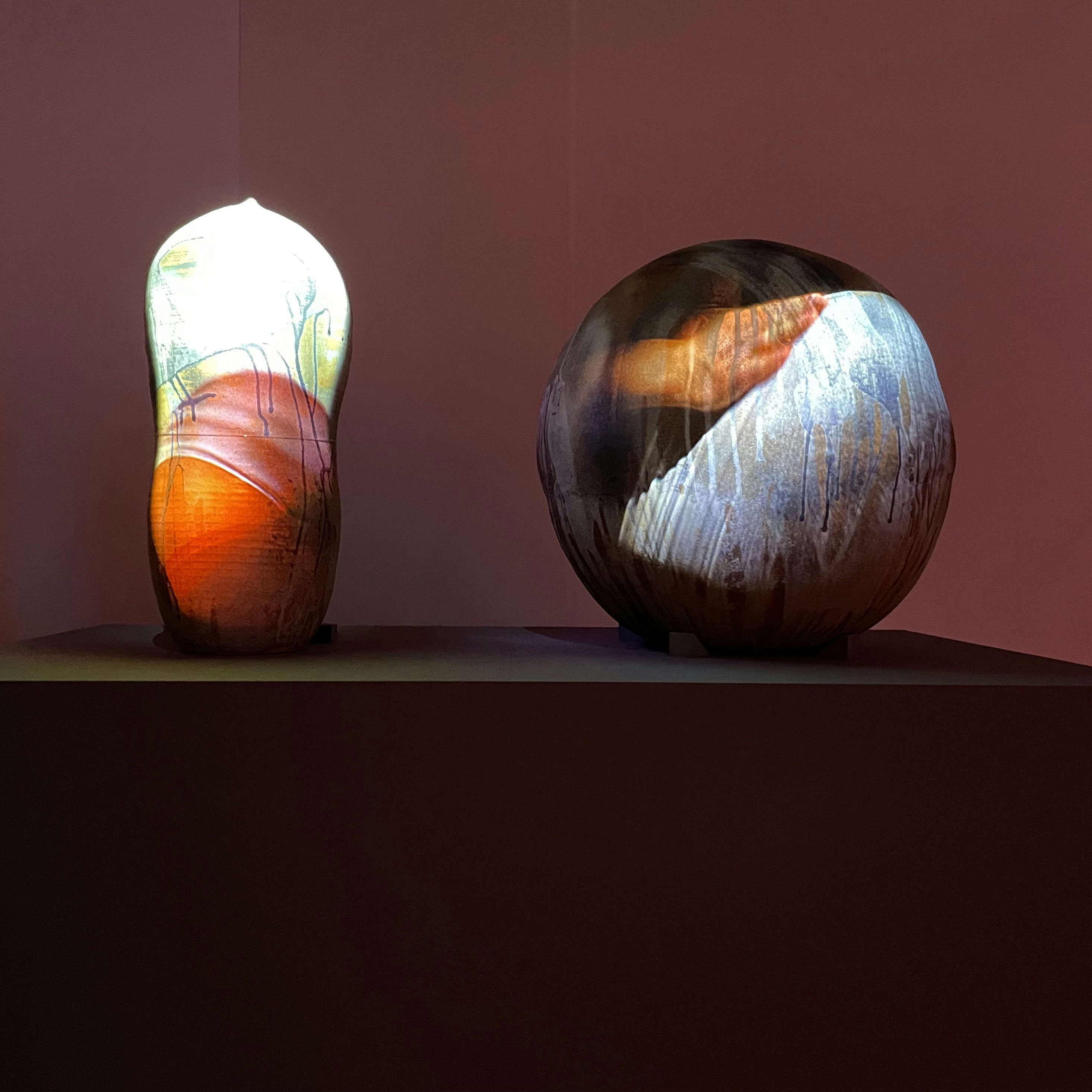 また本展では、京都国立近代美術館の収蔵品から十五代樂吉左衞門の茶碗と、日系アメリカ人のアーティスト、タカエズ・トシコの陶芸作品に映像を投影するコラボレーション作品も展示。静止したオブジェにイメージの動きを与えることで、新しい生命が吹き込まれる。