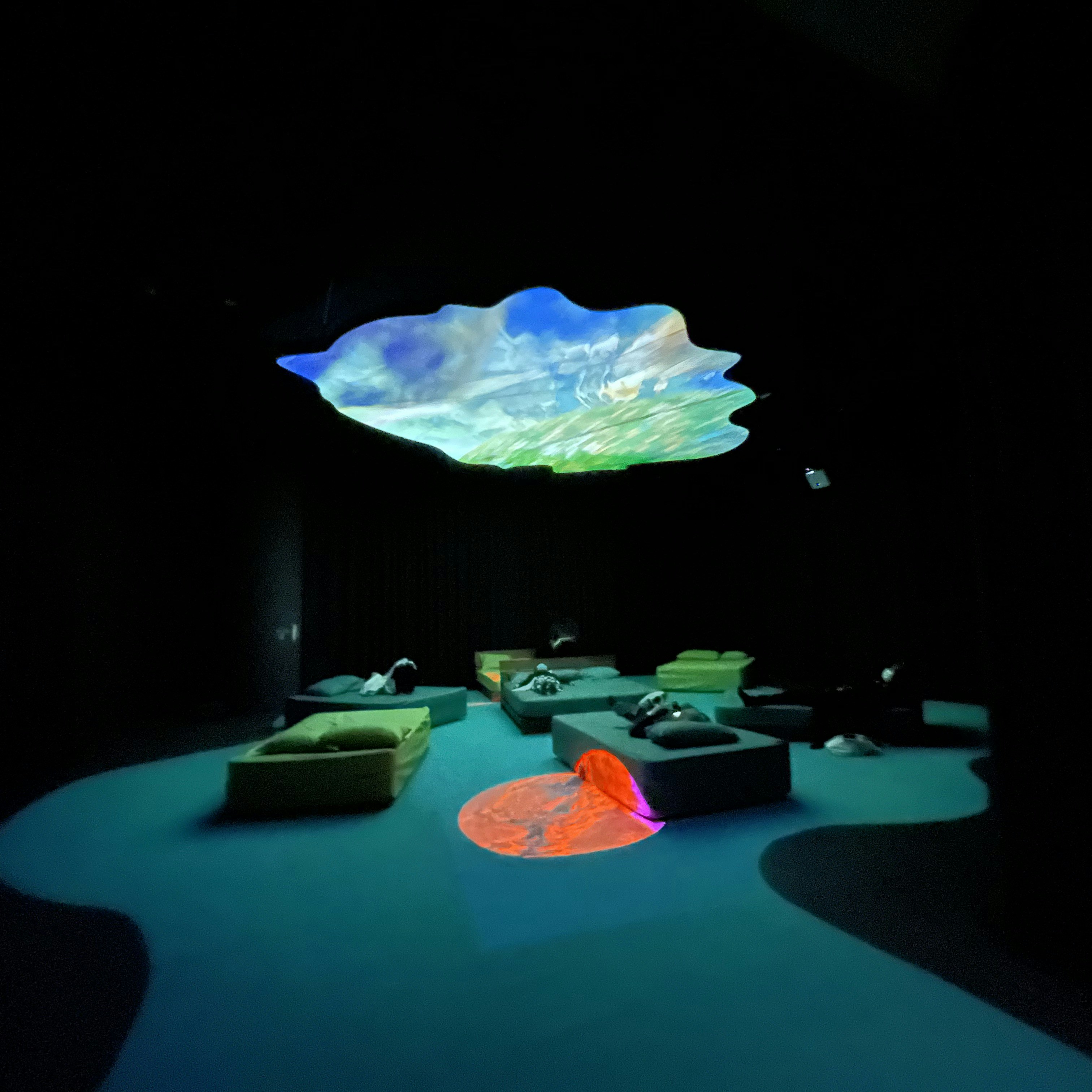 次の展示室では、天井から水平に吊るされた雲のようなかたちのスクリーンと、床にはランダムに置かれたベッドによって構成された《4階から穏やかさへ向かって》(2016)が大きな存在感を放つ。スクリーンには水中で撮影された断片的な映像が投影されており、鑑賞者はベッドに横たわって心身ともにリラックスした状態で作品を鑑賞することで、まるで水中にいるかのような錯覚に陥る。