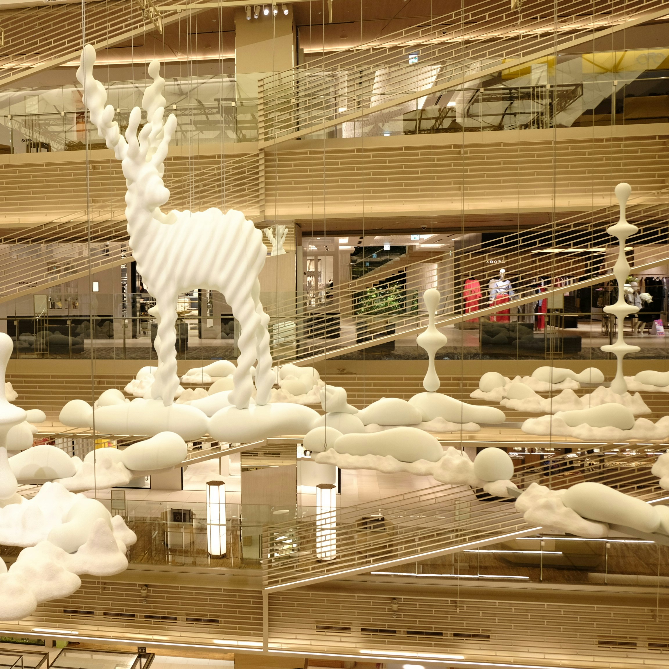 今春、開業4周年を迎えるGINZA SIXの中央にある吹き抜けの空間では、これまでに草間彌生やダニエル・ビュレン、ニコラ・ビュフ、塩田千春、クラウス・ハーパニエミ、吉岡徳仁といったアーティストやデザイナーが作品を展示してきた。