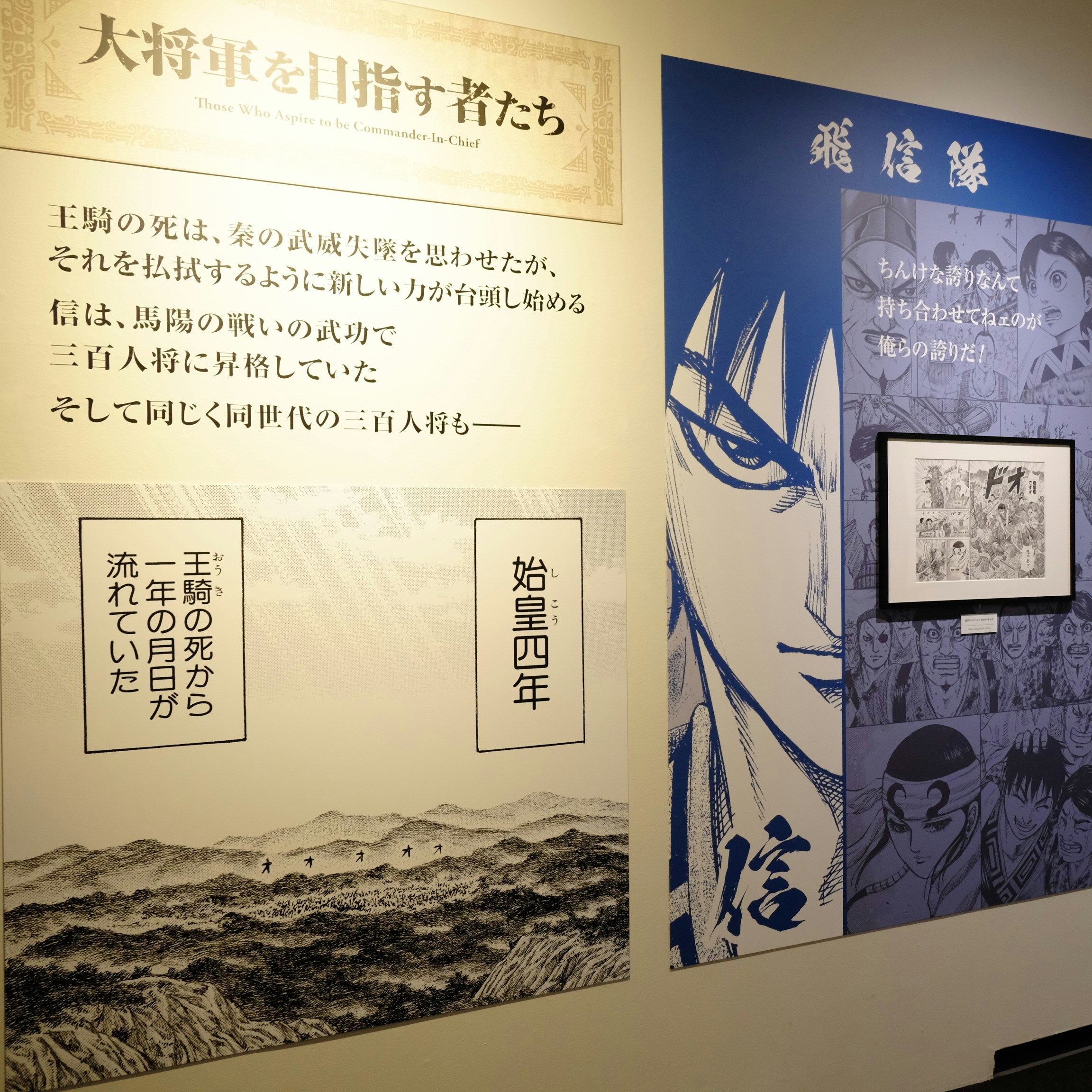 第12章「人の本質は光」は嬴政の「人の本質は光」という問いがいかに生まれたのかを、描きおろしのカラー原画や大型パネルによって情感豊かに表現。そして、第13章では天下の大将軍となった信の未来の姿の描きおろしを展示し、信の夢の行方を象徴的に告げる。