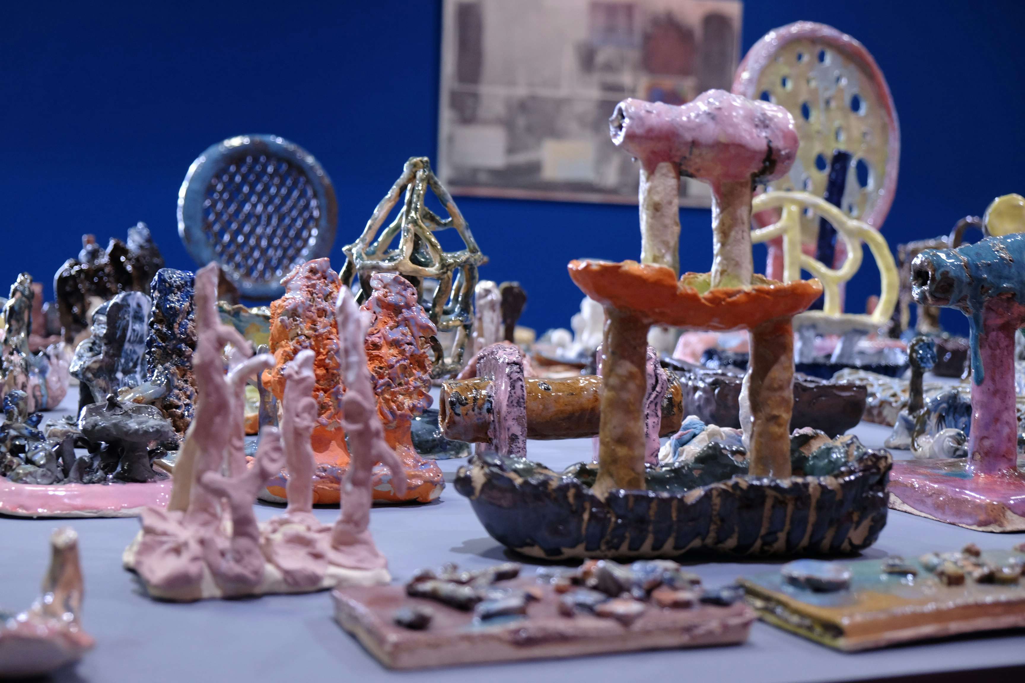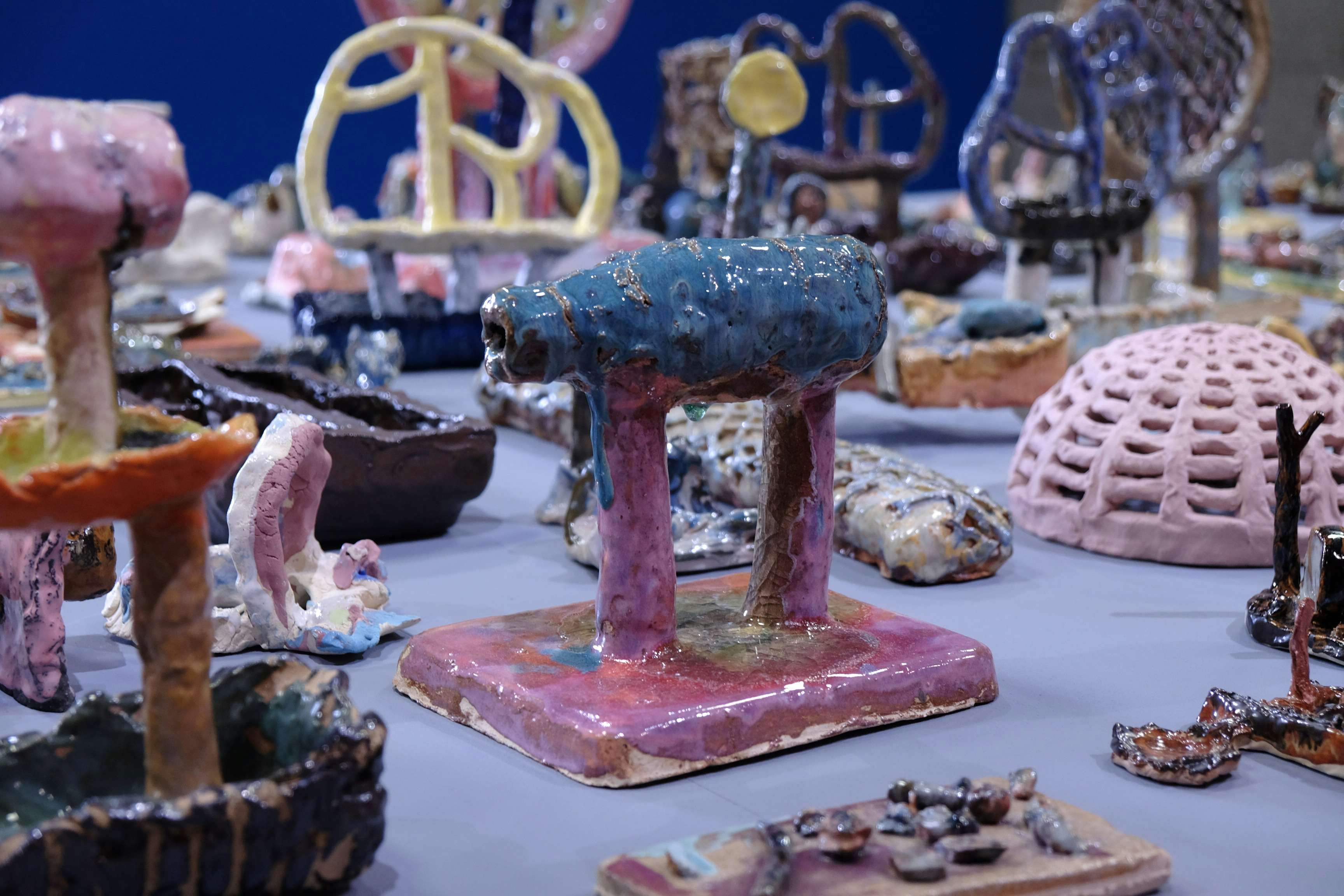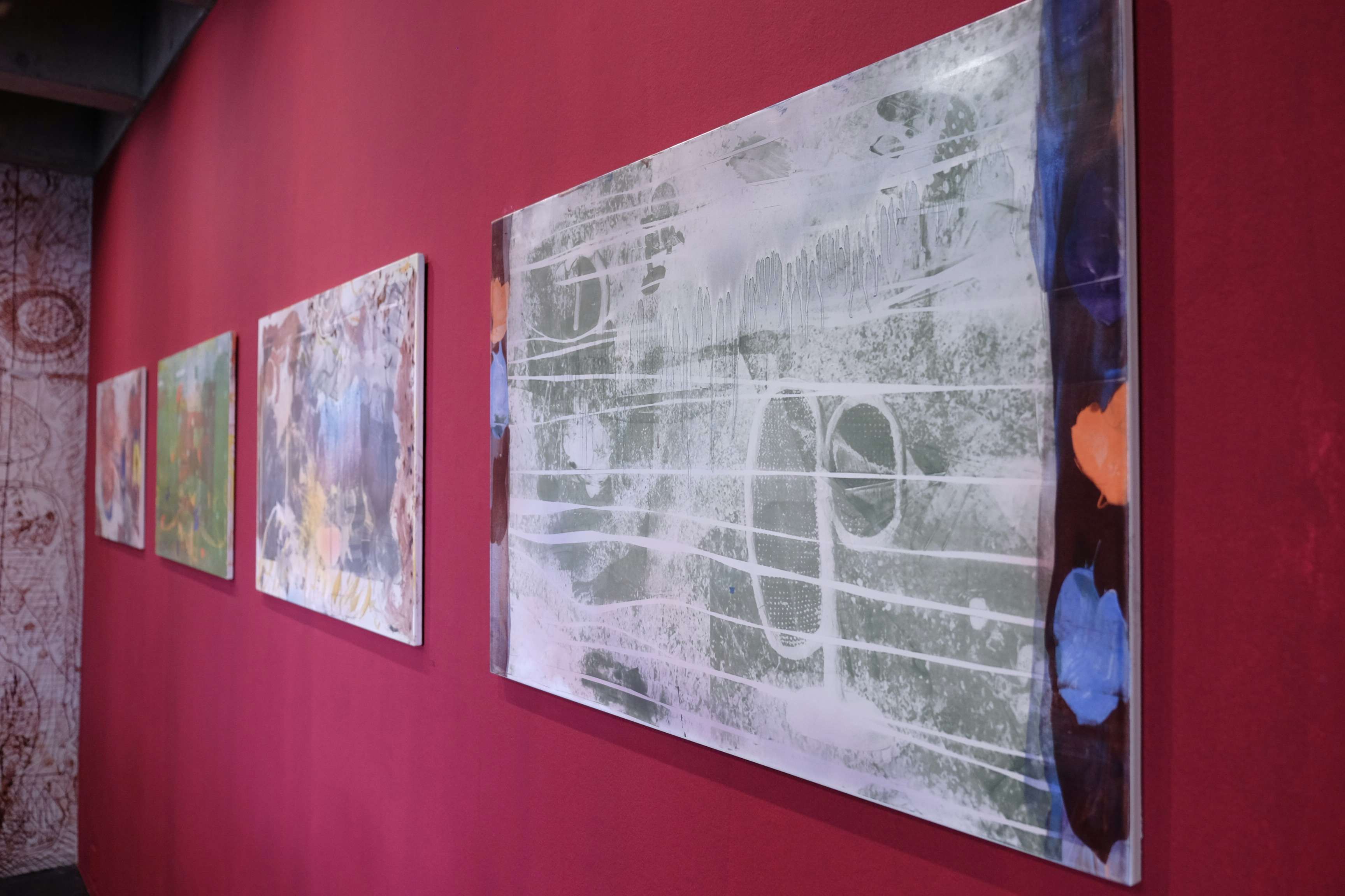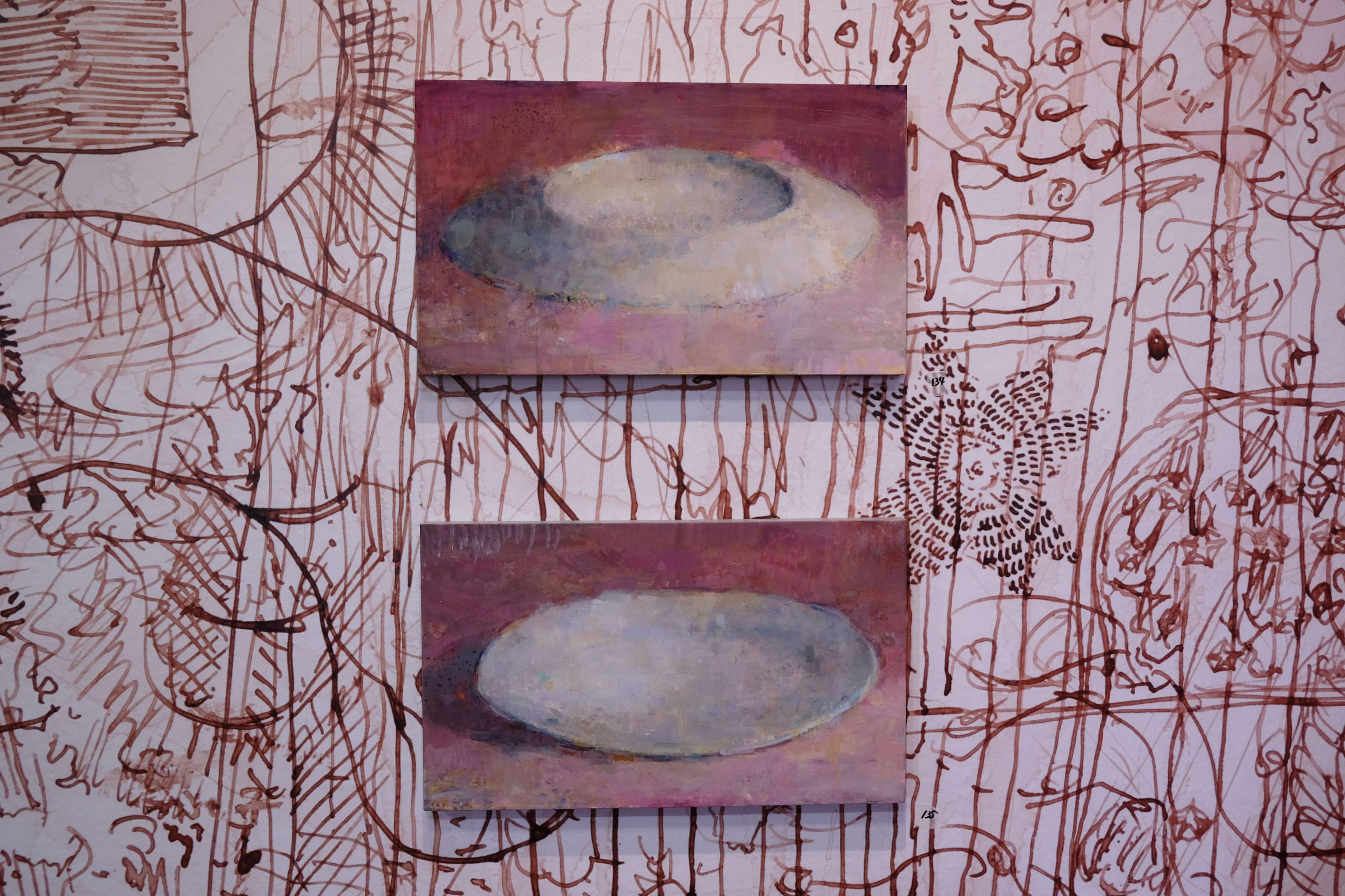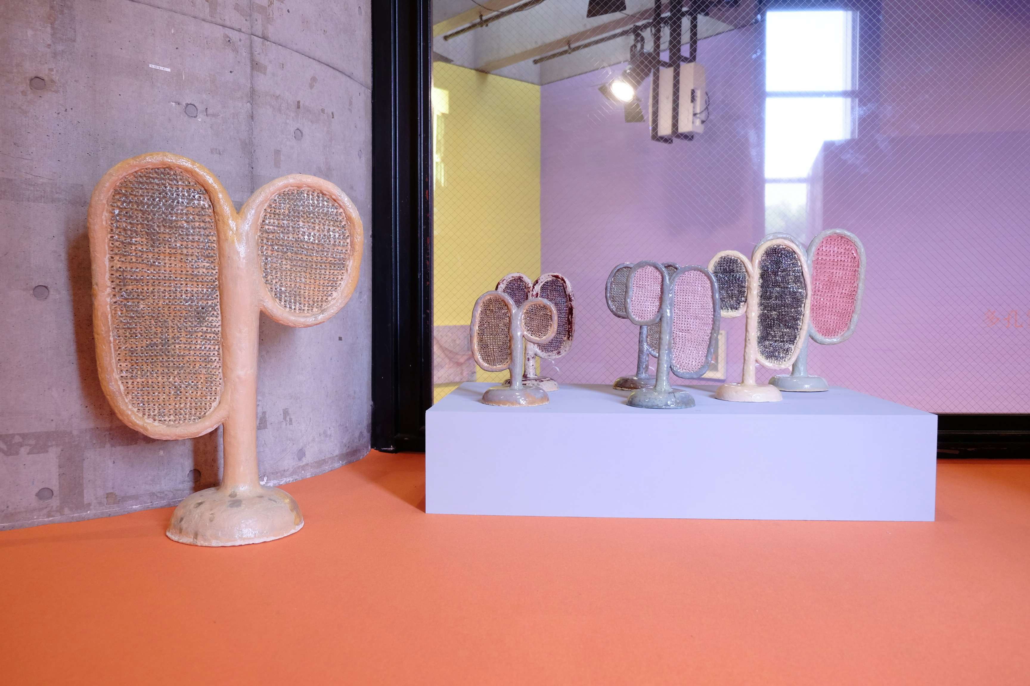 「梅津庸一 ポリネーター」展示風景より、「花粉濾し器」シリーズ(2020-2021)