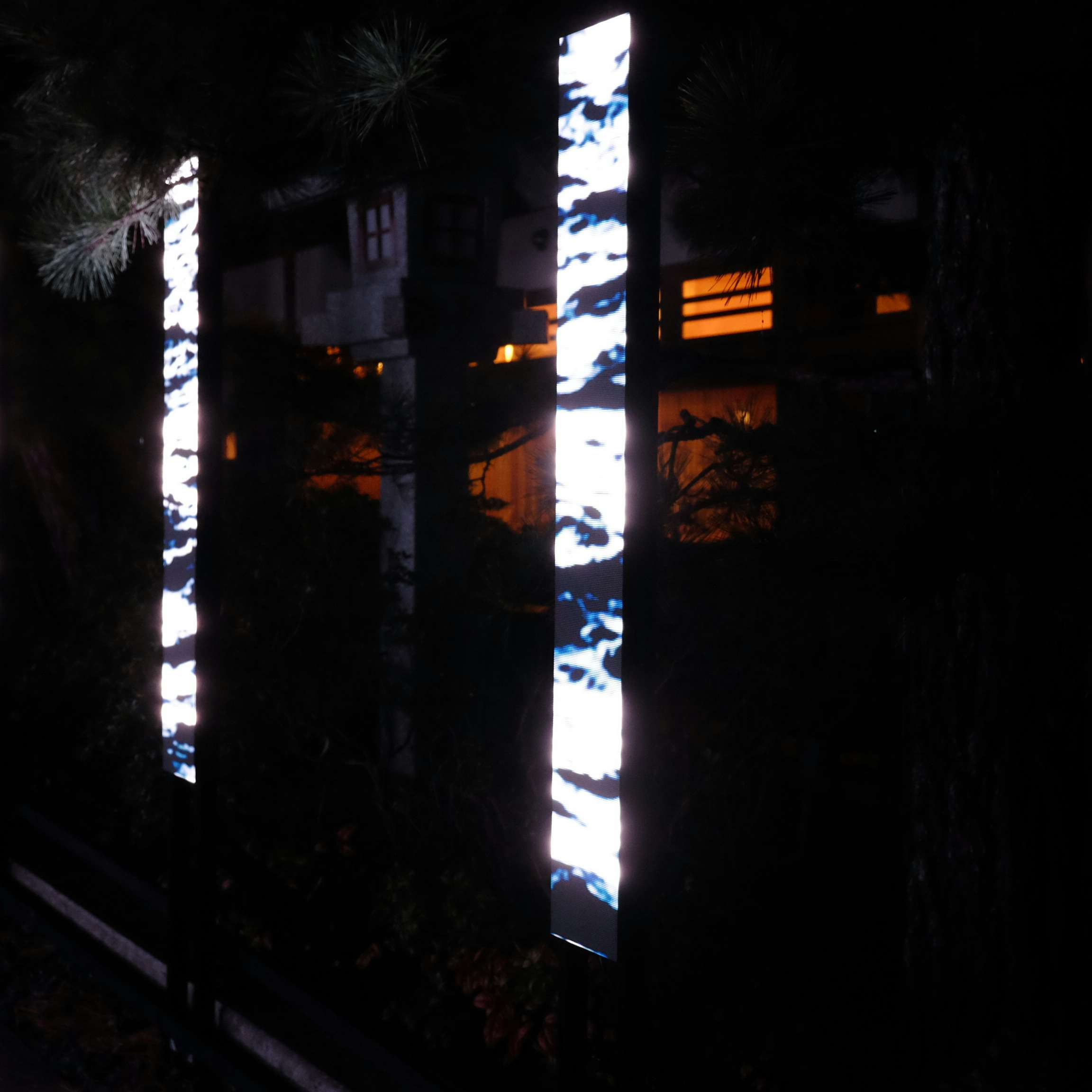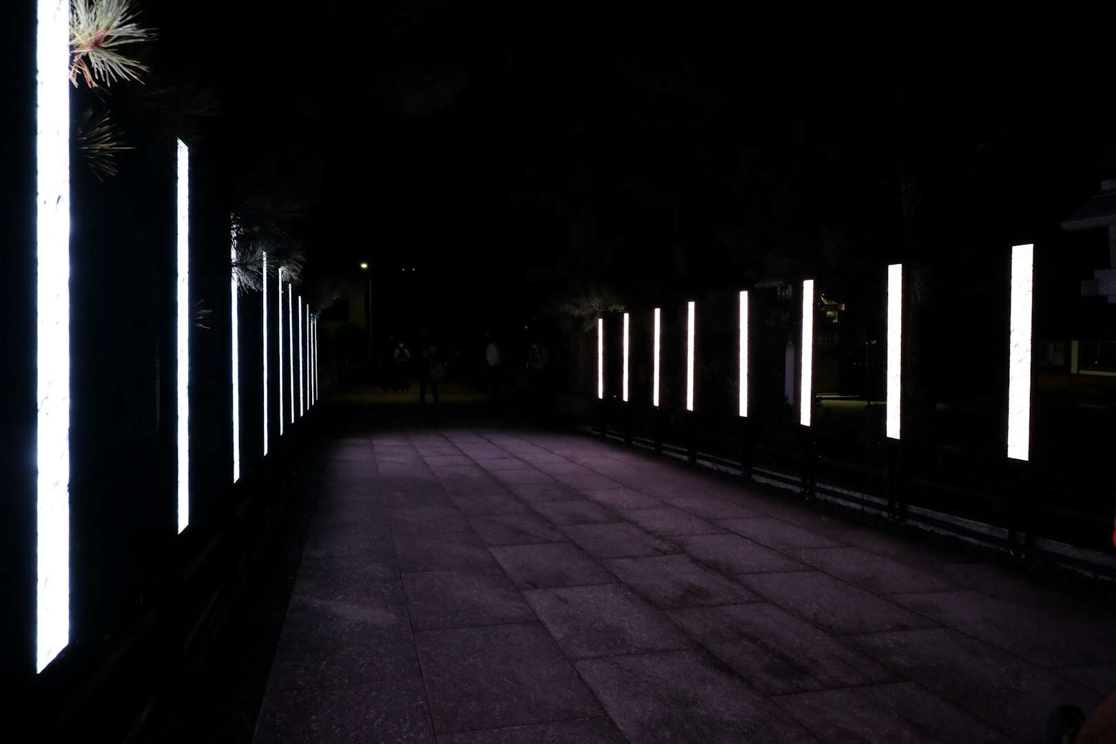 原と白木は天橋立に続くように伸びる神社の参道に、40本の柱状のLEDと16個のスピーカーを設置。世界中の海や空をモチーフとした色と音が、明け方から夜にかけて変化する様が、8分間のシーケンスで表現される。
