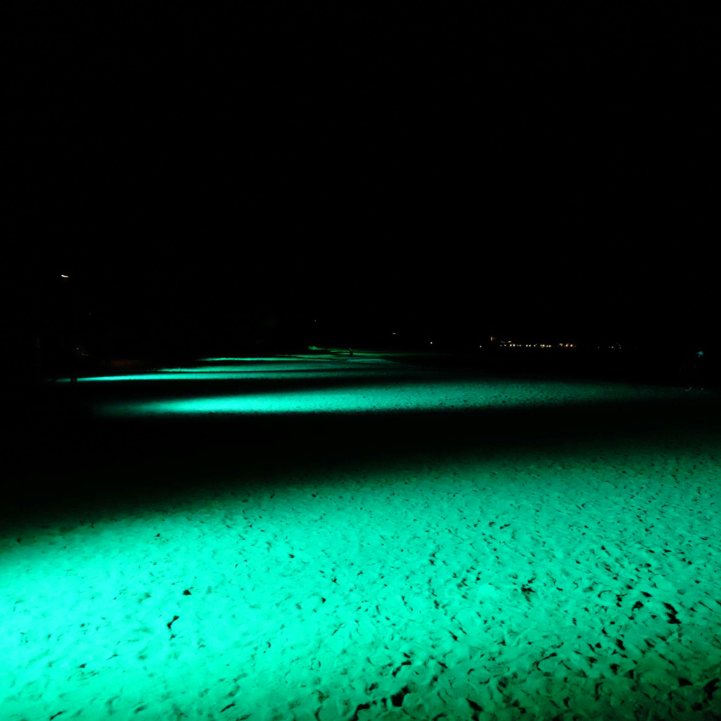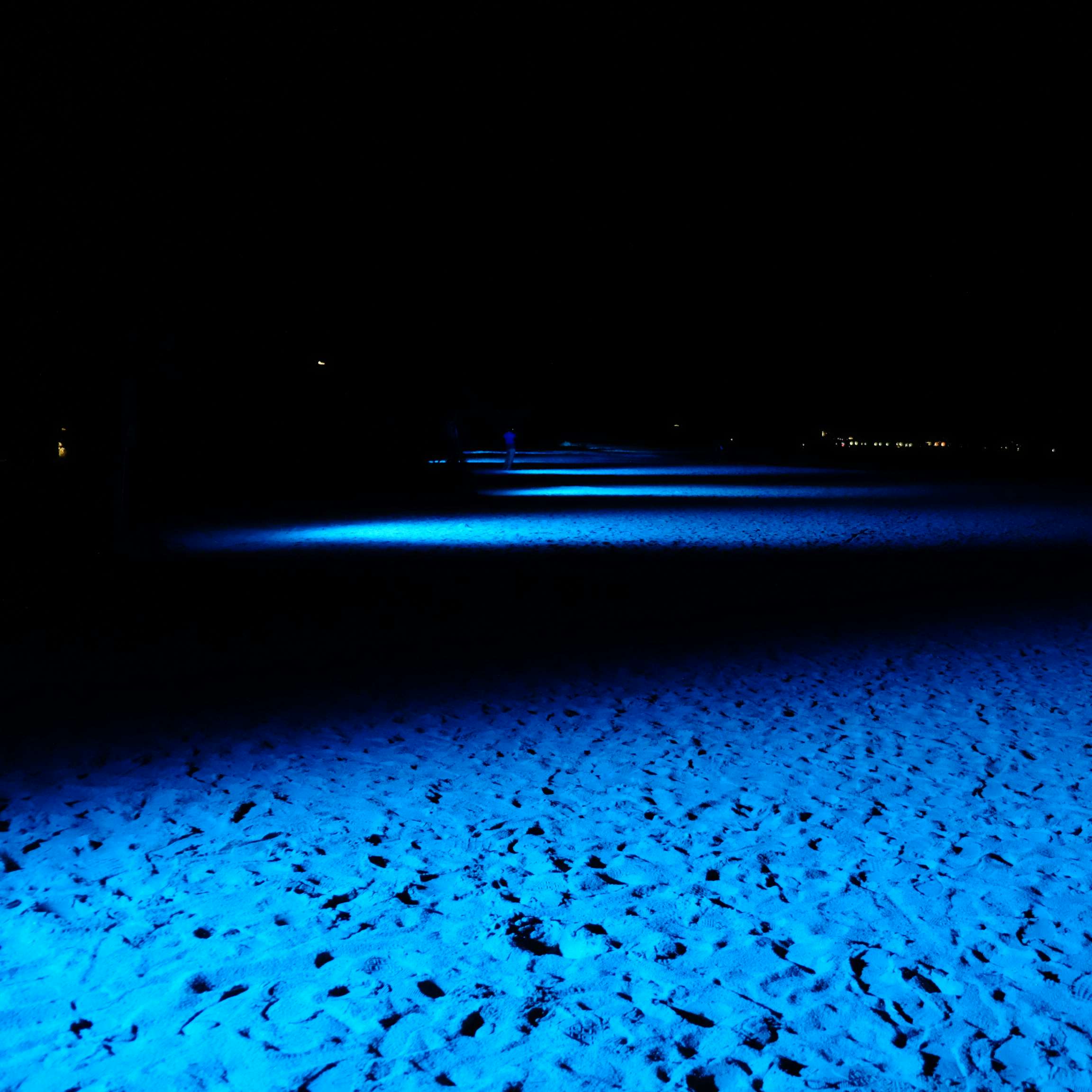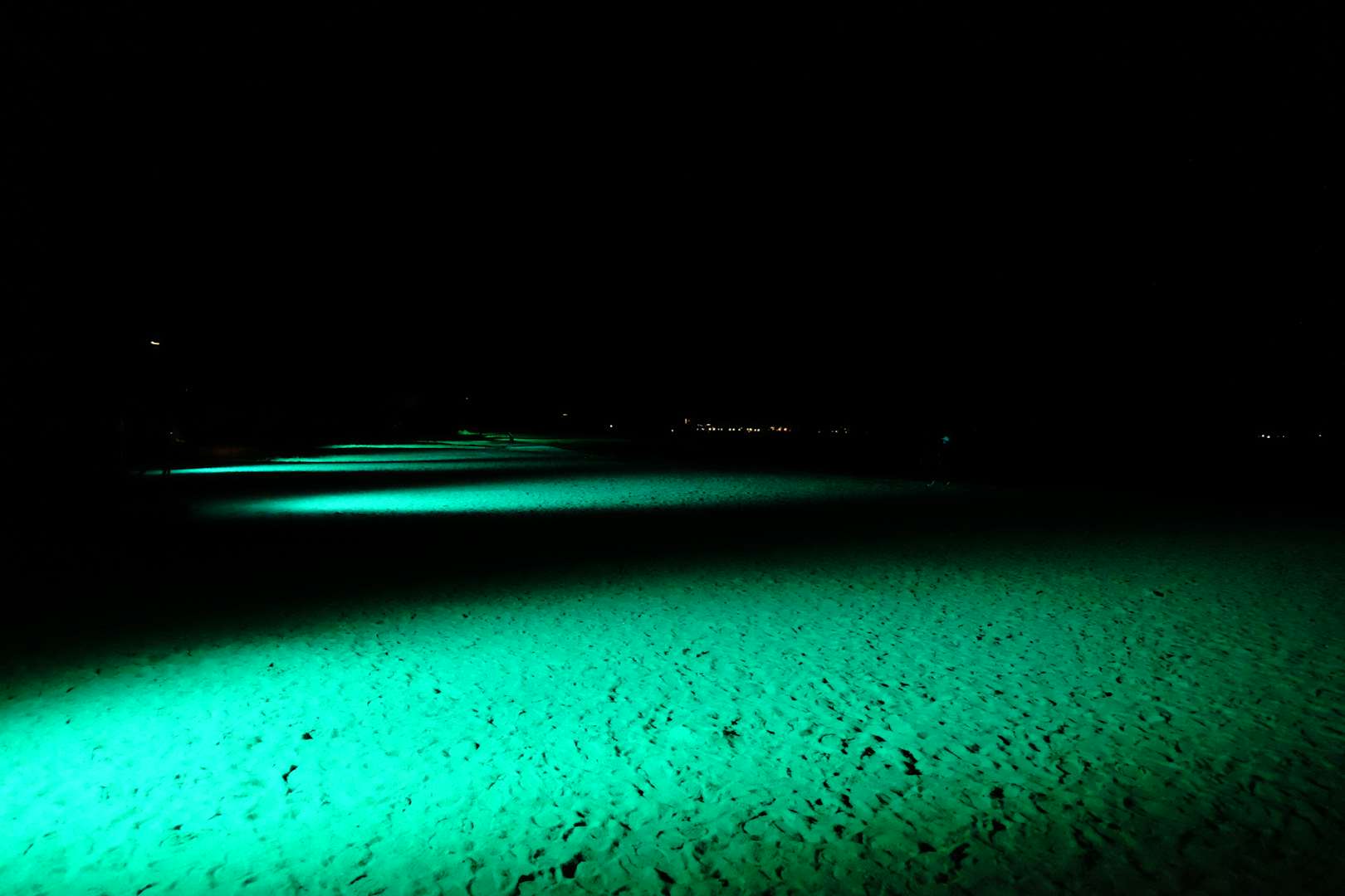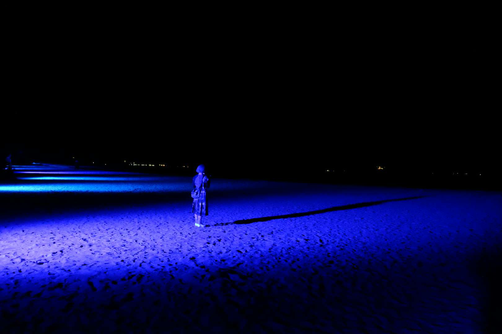 全長600メートルの浜辺に配置された照明が、フィールドワークをもとに制作されたという平井の楽曲とともに様々に変化。楽曲は海から聞こえる波の音と混ざり合い、浜辺というシチュエーションならではの体験をすることができる。