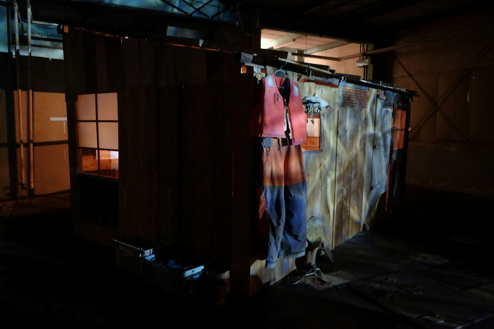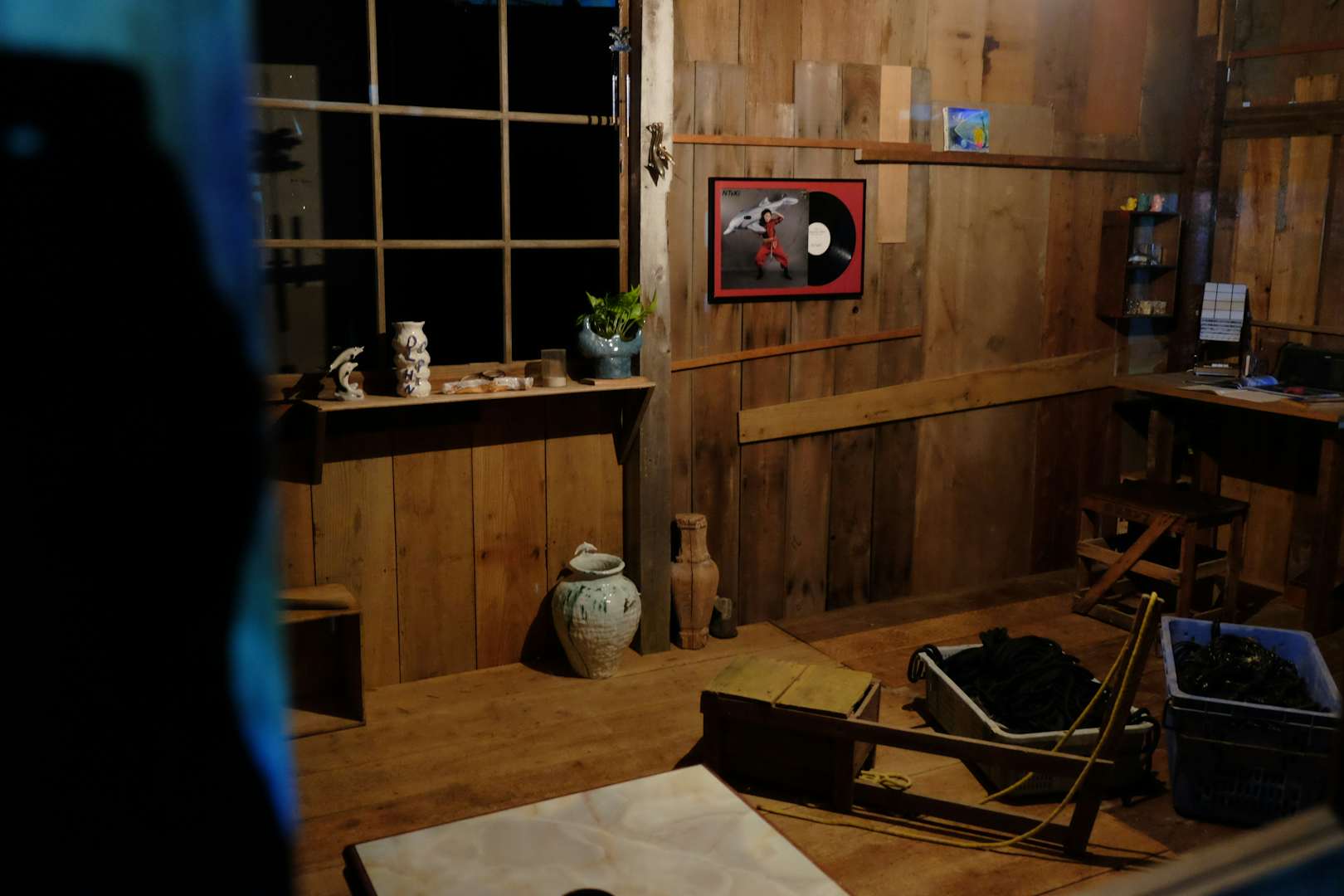 廃材を集めてつくられた小屋のなかには、3人の作家が持ち寄った品々が集められ、ドルフィン・マンの生活を窓の外から覗き込むことができる。映像はNTsKiが手がけ、小屋の設置をDAISAKが、照明などの演出を川勝が担当し、3人の共同ディレクションによる作業でつくりあげた。