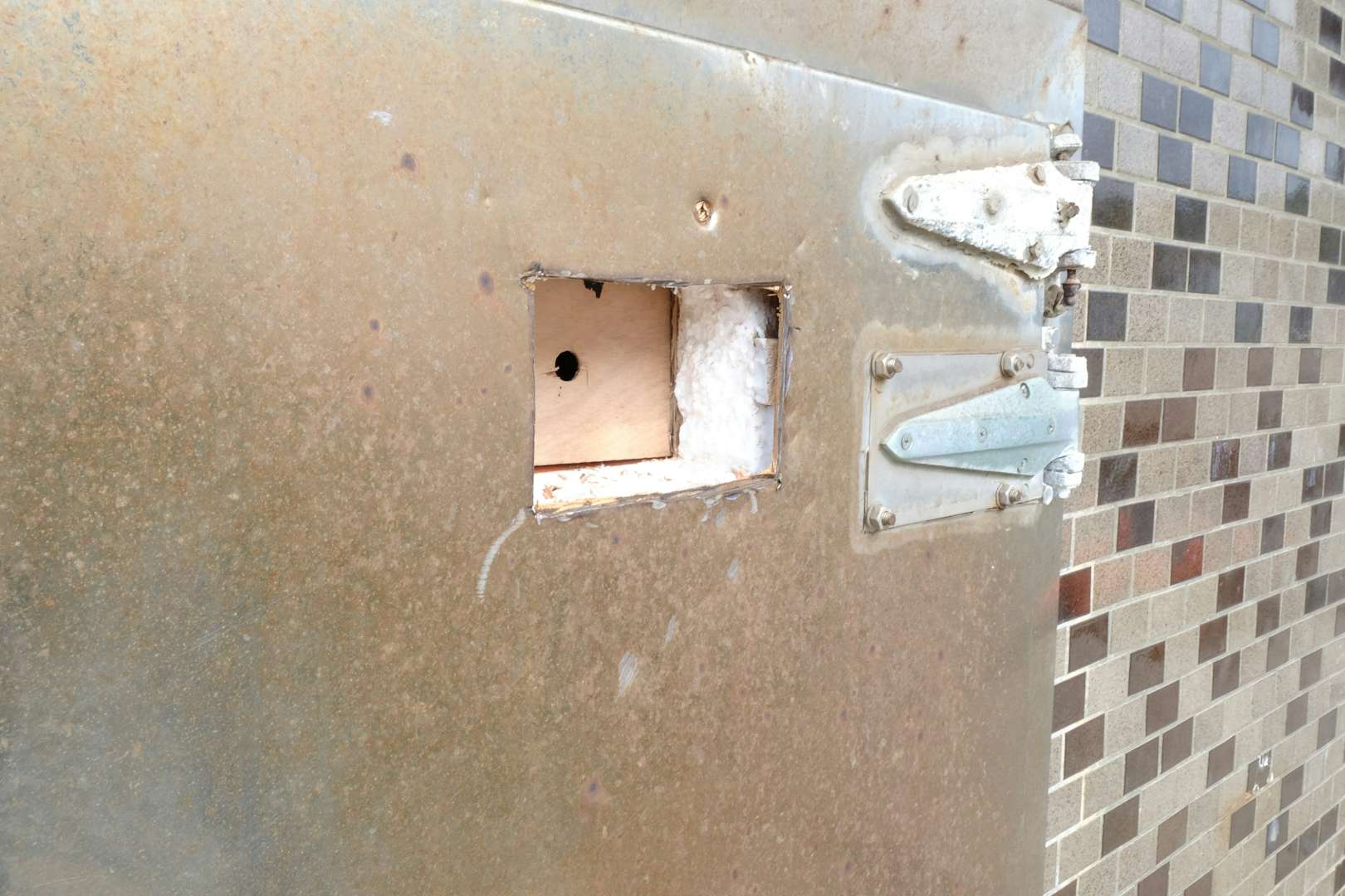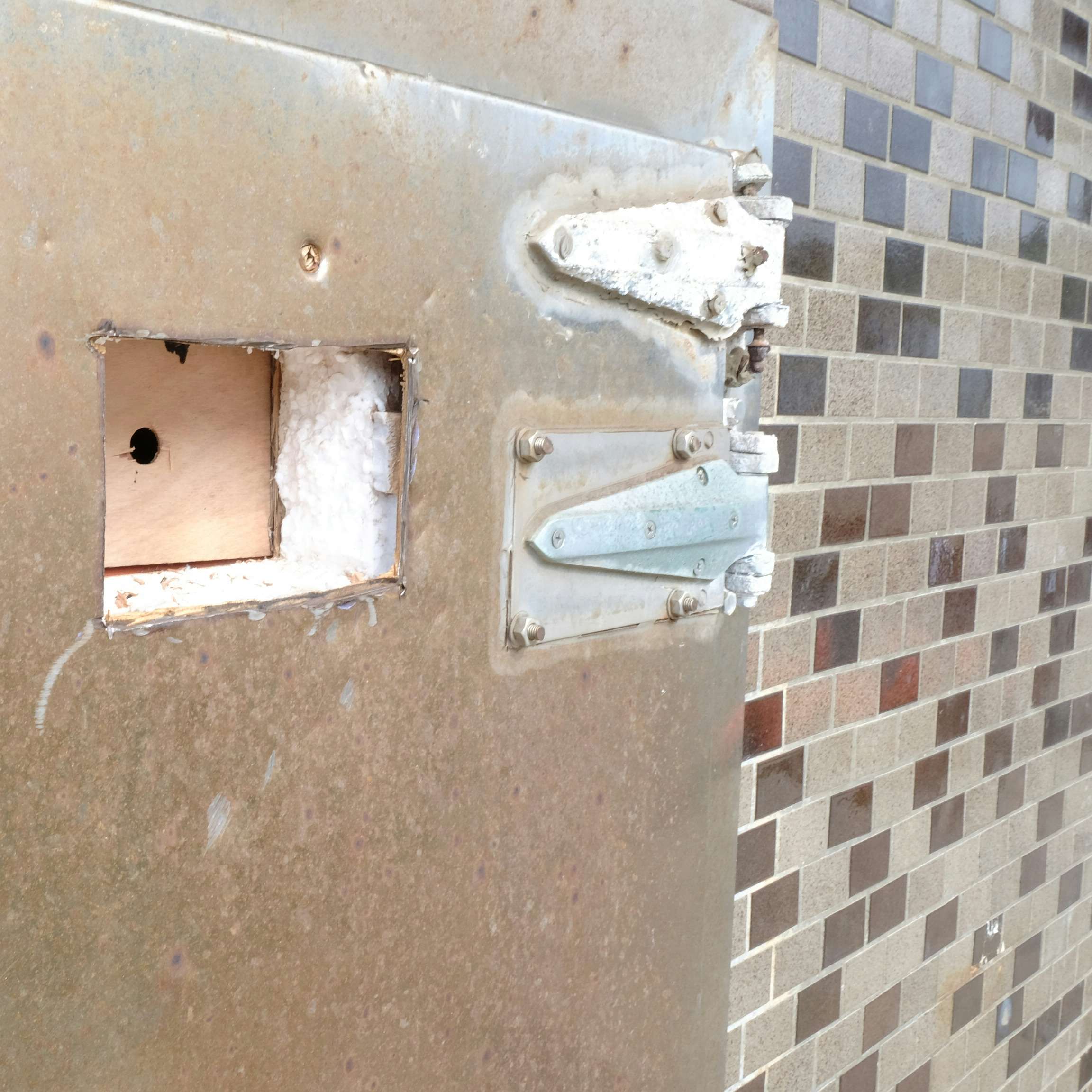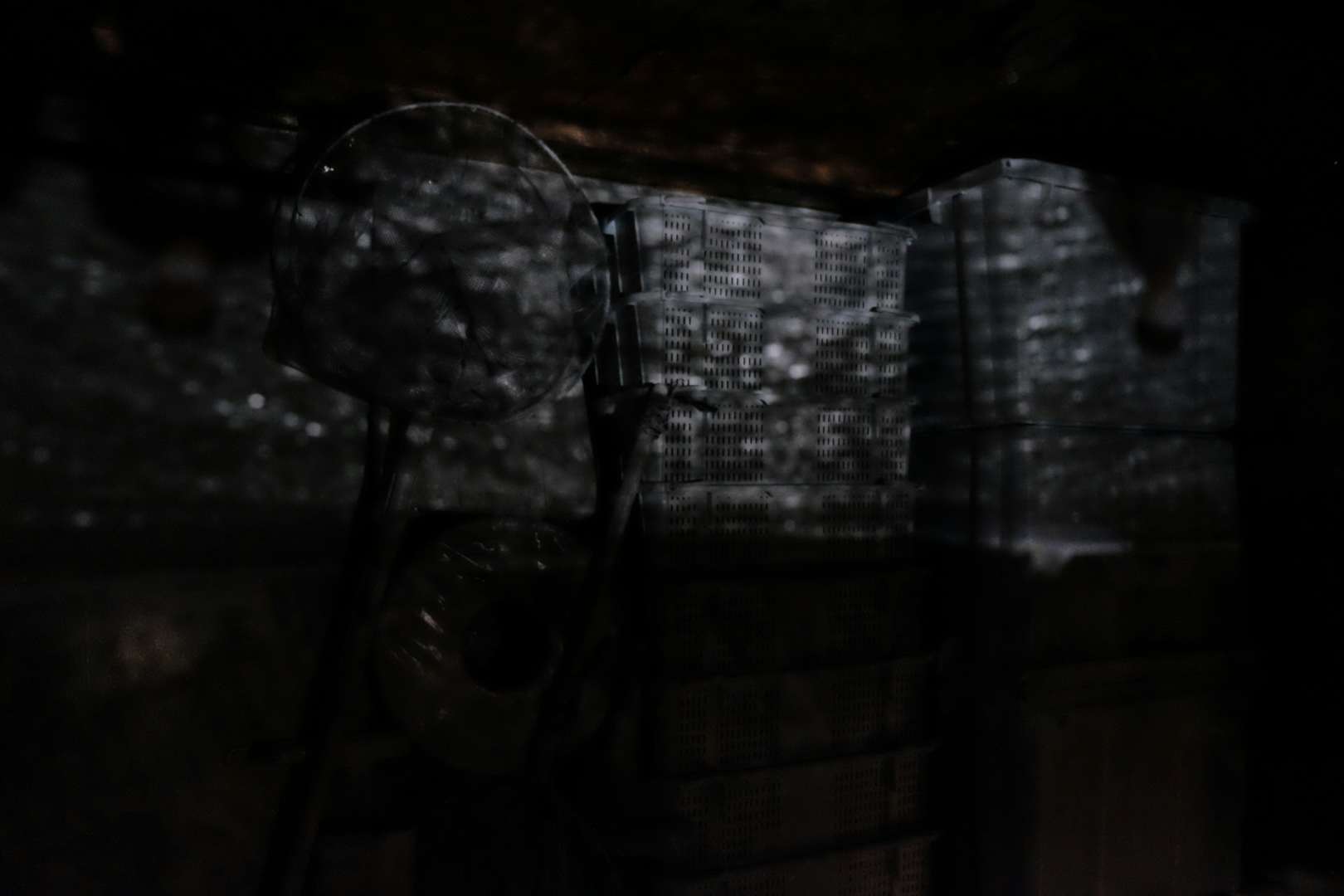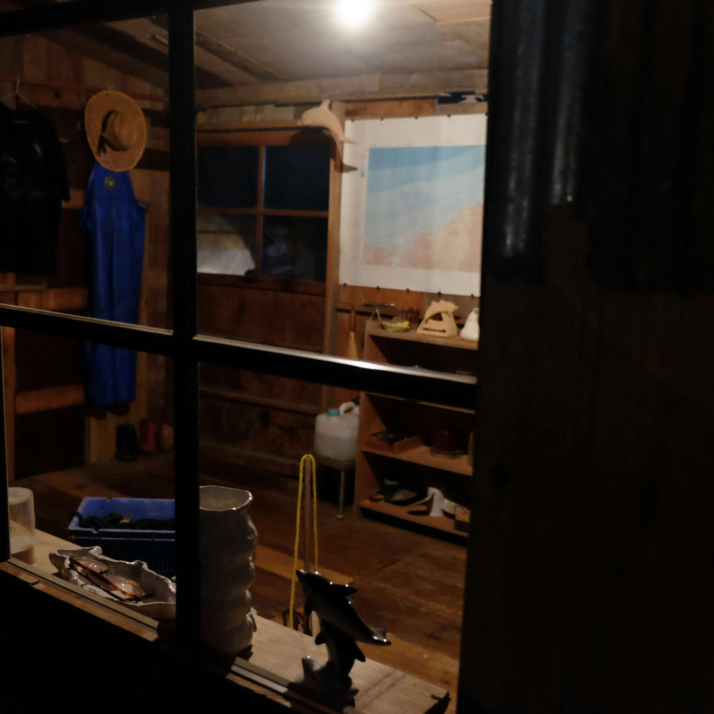 ここで石毛は、元田重機業織物工場で展開した《みえる》を、異なるかたちで展開。使われなくなった鮮魚用の冷凍庫を利用し、原初的なカメラの仕組みである「カメラ・オブスキュラ(暗い部屋)」をつくりあげた。冷凍庫側面に空けた小さな穴を利用し、漁港の波を部屋のなかに映し出すことで、織物工場と同様に、外に存在するありのままの光景を屋内に運び込む試みが行われた。