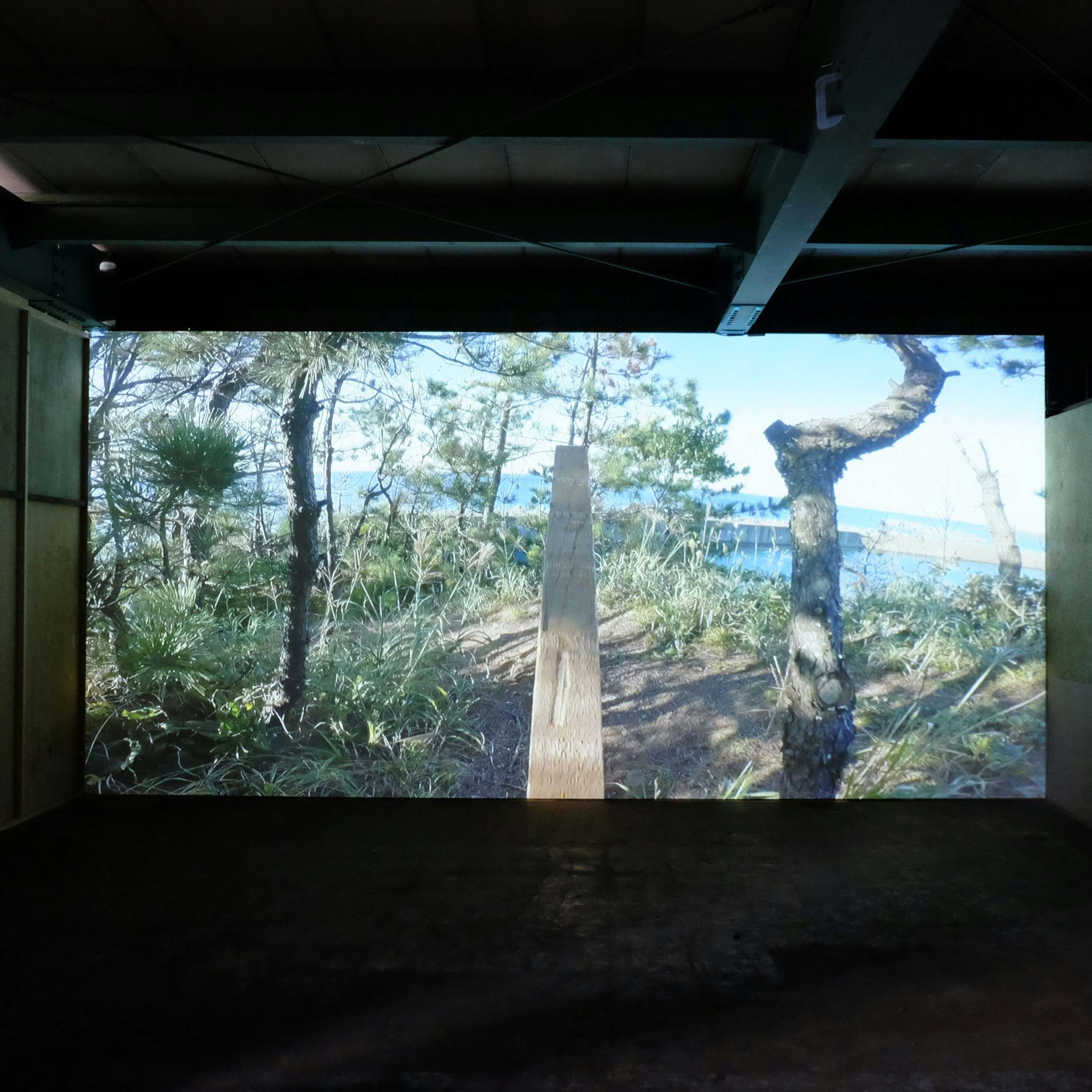 展示を奥に進むと、映像作品が上映されている。これは、かつて丹後半島のいたるところにあった灯台の跡地に、角材でふたたび常夜灯を灯すという作品だ。海外線にあった人々の営みに再び目を向けるとともに、人類の歴史よりもスケールが大きい、自然のダイナミズムも描き出した。