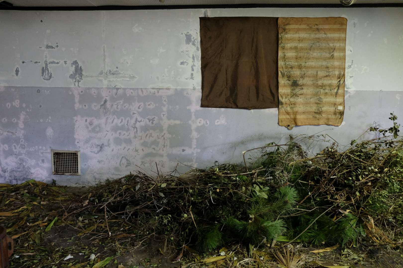 鷲尾は芝を刈る過程で、庭から出てきた様々な布や、隣家の住人が提案した椿の木の搬入などを実施。展示空間の窓から見える隣家の庭の構成物が、そのまま室内に移動したような作品《for mi》ができあがった。