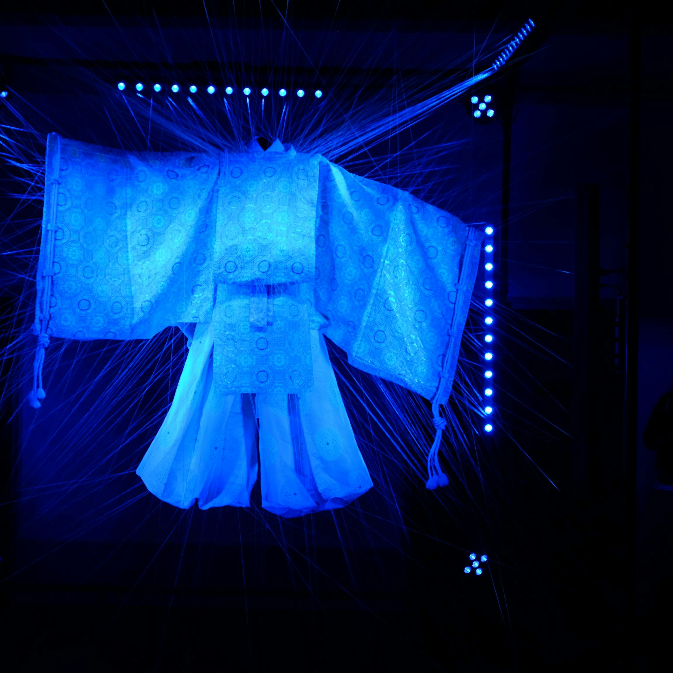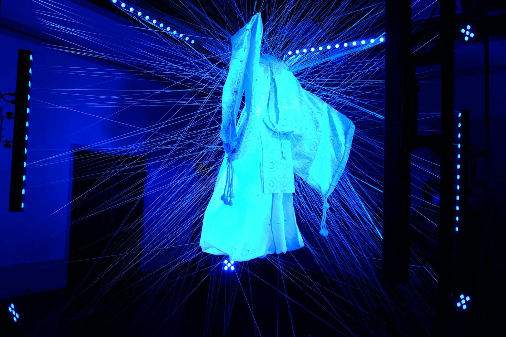 この旧庁舎では、アーティストのスプツニ子!とファッションデザイナーの串野真也によるユニット、ANOTHER FARMが《Boundaries》を展示している。暗い部屋の中で浮かび上がった、青色に光る能装束。この装束は、クラゲの遺伝子を組み込まれたカイコによって吐き出された、特殊な絹糸によってつくられている。