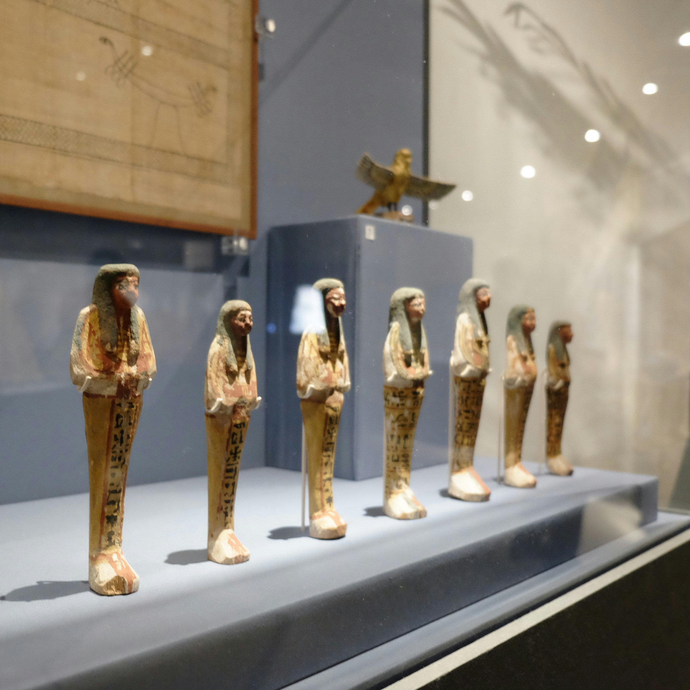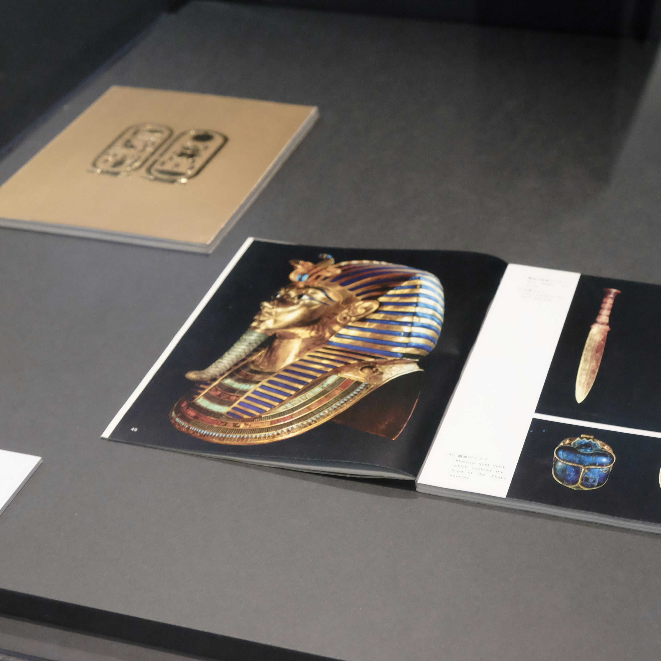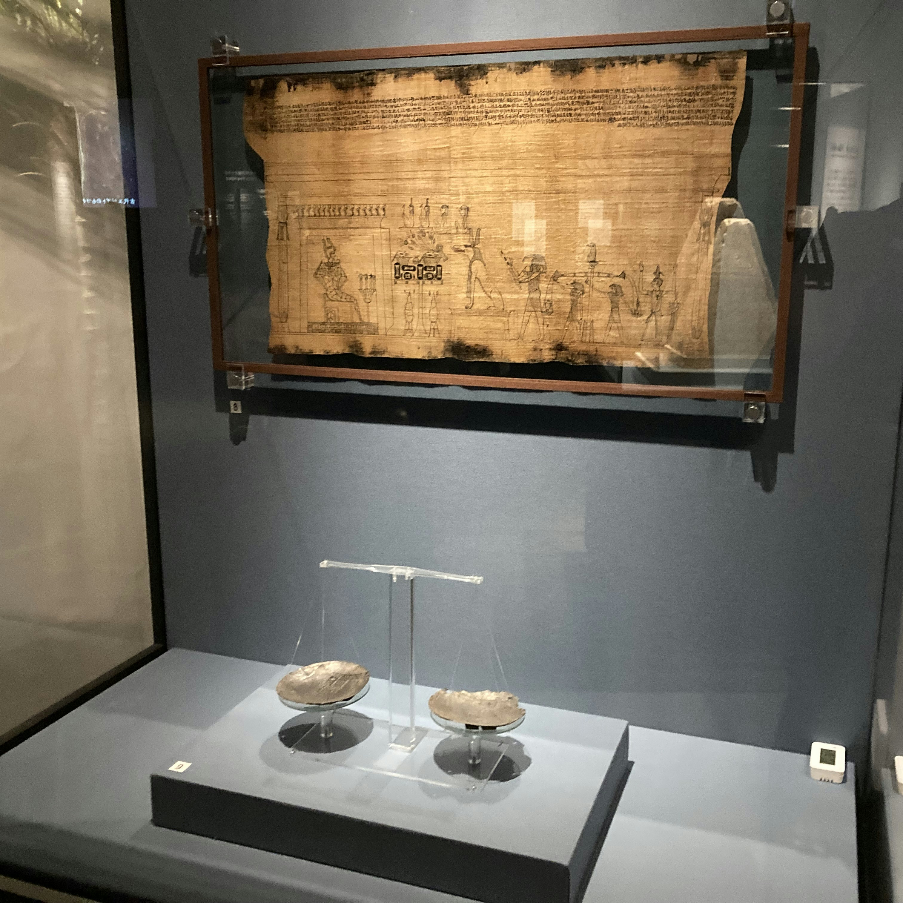 ほかにも、古代エジプトの葬送にまつわる信仰をいまに伝える『死者の書』や、内蔵を納めるカノポス壺、ミイラづくりや葬祭の道具などがともに展示されている。