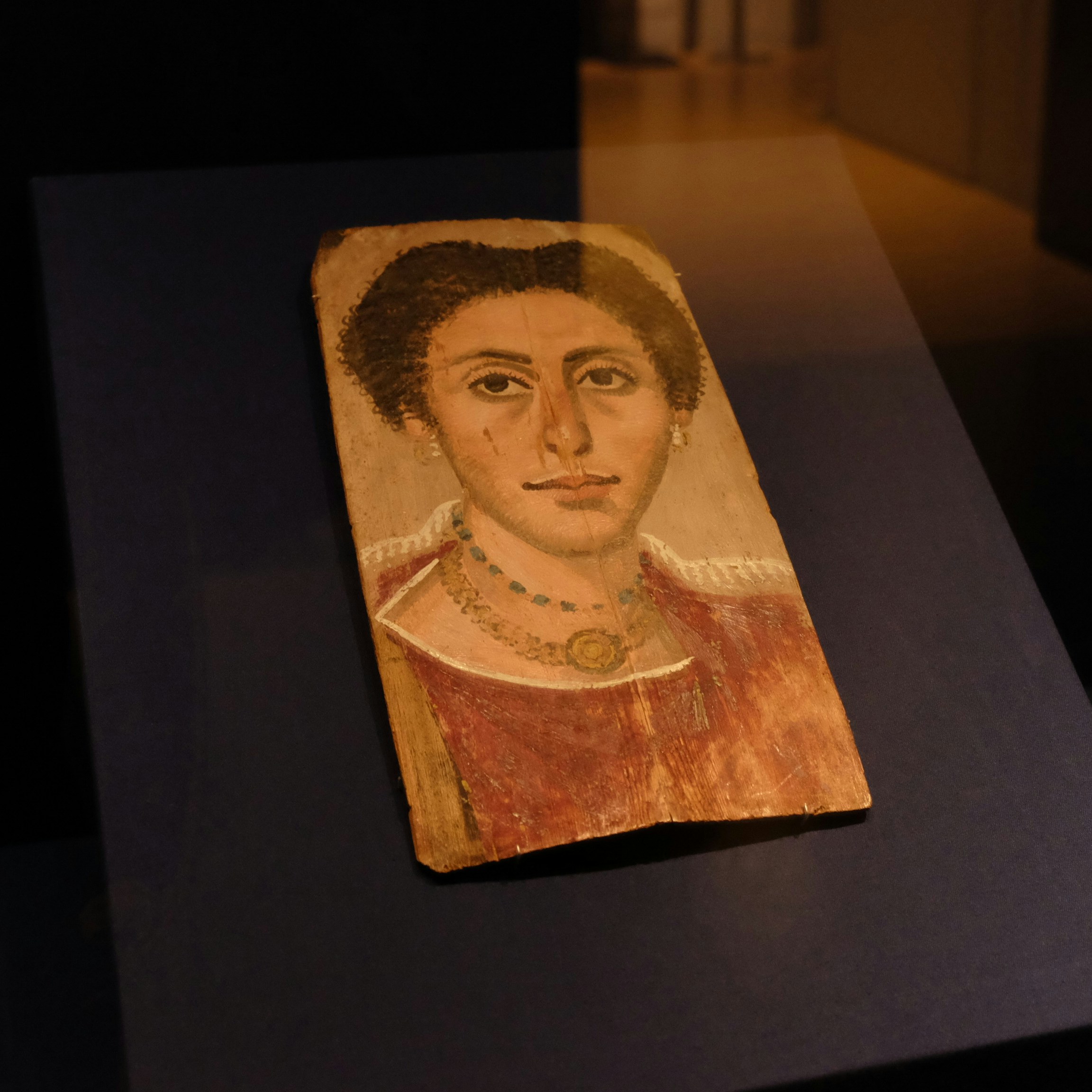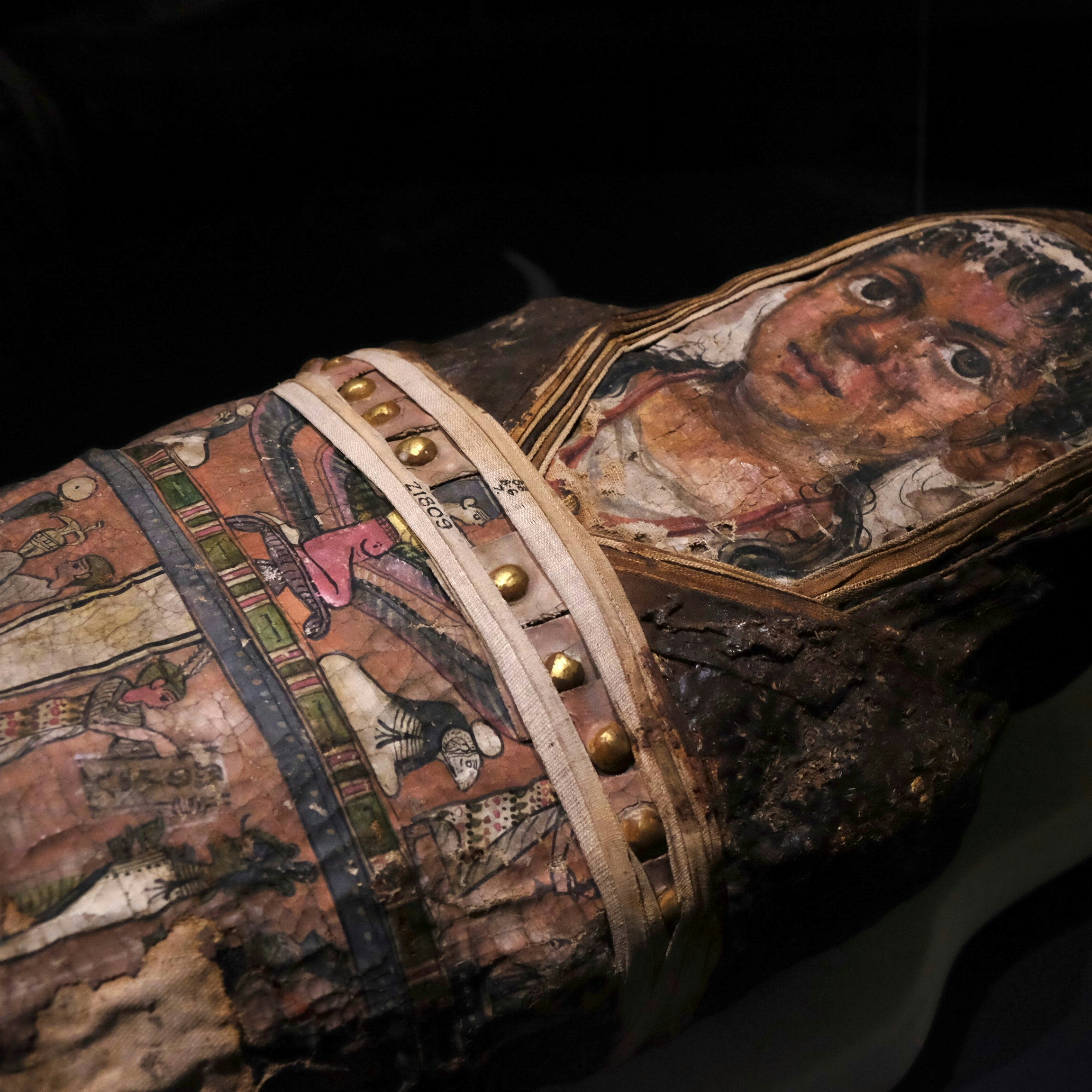 また、今回の展覧会では子供のミイラも来日した。ファイユーム地方のハワラで出土したこのミイラは、CTスキャンによる骨格と歯の発育程度から、3〜5歳の幼児だと推定されている。ローマ支配時代の後40〜55年ごろのものであるこのミイラは、社会的地位の高い家族の一員だったと考えらており、頭部に肖像画が描かれている。