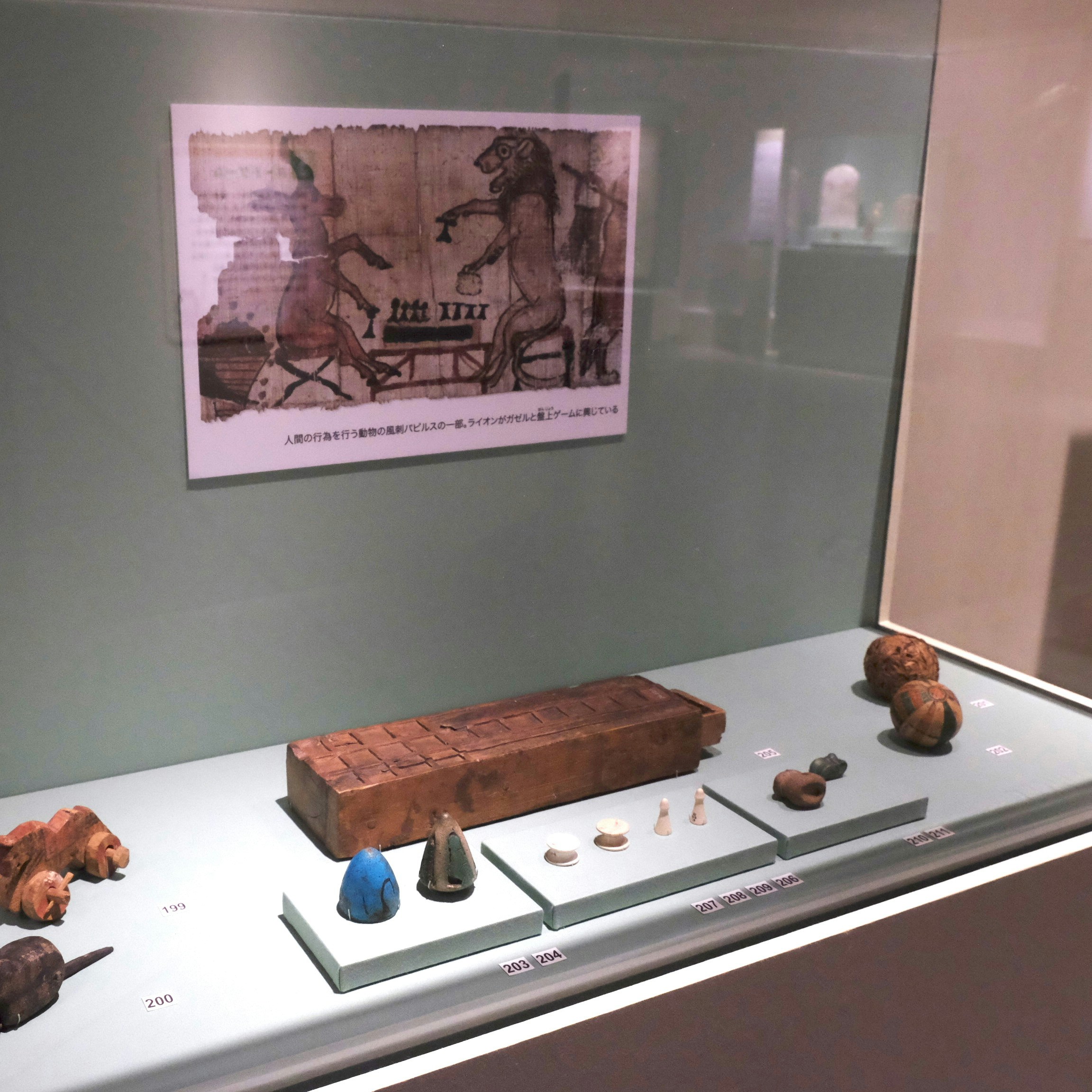 子供のミイラとともに古代エジプトの子供たちが遊んだ玩具や身につけた装身具、子供の魔除けなども展示されており、死亡率が高い時代だからこそ、その成長を真摯に祈った人々の姿が浮かび上がってくる。