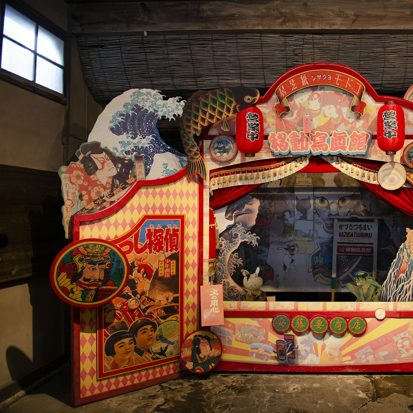 中国出身のマー・リャンは、日本の古い紙芝居小屋にインスピレーションを得て《移動写真館》をオープン。フレームのなかに入り、裏に置かれたコスチュームや小道具を身につけて記念写真を撮ることで、紙芝居の世界に入り込むことができる。