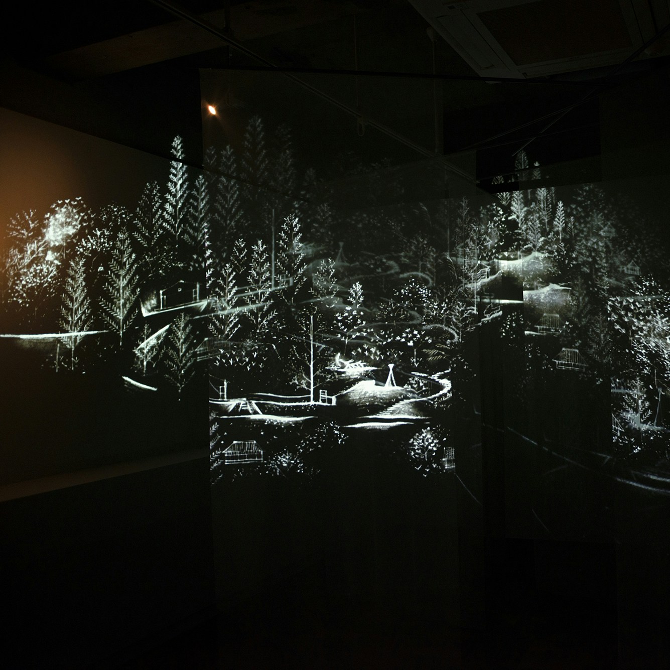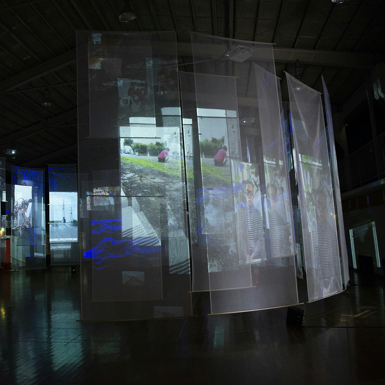 コロナ禍で制作に励むアーティストたちの声を集め、その動画を美しいインスタレーションに展開したのが、映像作家の高橋啓祐がインスタグラムで行うプロジェクト《Artists’ Breath Playback》。旧里見小学校体育館の空間が活用され、アーティストの声に耳を傾けると同時に幻想的な光の体験ができる。