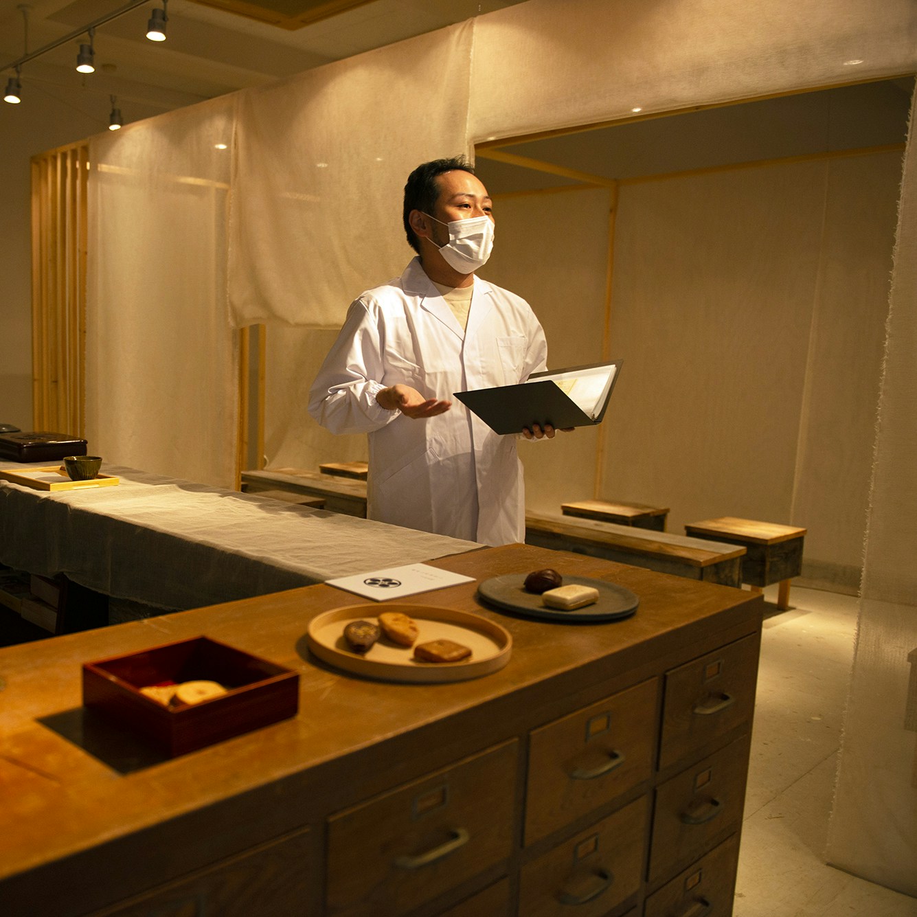 校舎2階の教室は、EAT&ART TARO《おかしのはなし》。地域ならではの伝承や逸話をもとに創作された千葉県のお菓子を集め、お菓子とお茶をいただきながらそのストーリーを作家と鑑賞者が共有するプロジェクト形の作品だ。お菓子を通して房総を知る。食をテーマにリサーチと制作を続けるEAT&ART TAROが、芸術祭を巡る際の一服の時間を提供してくれる。