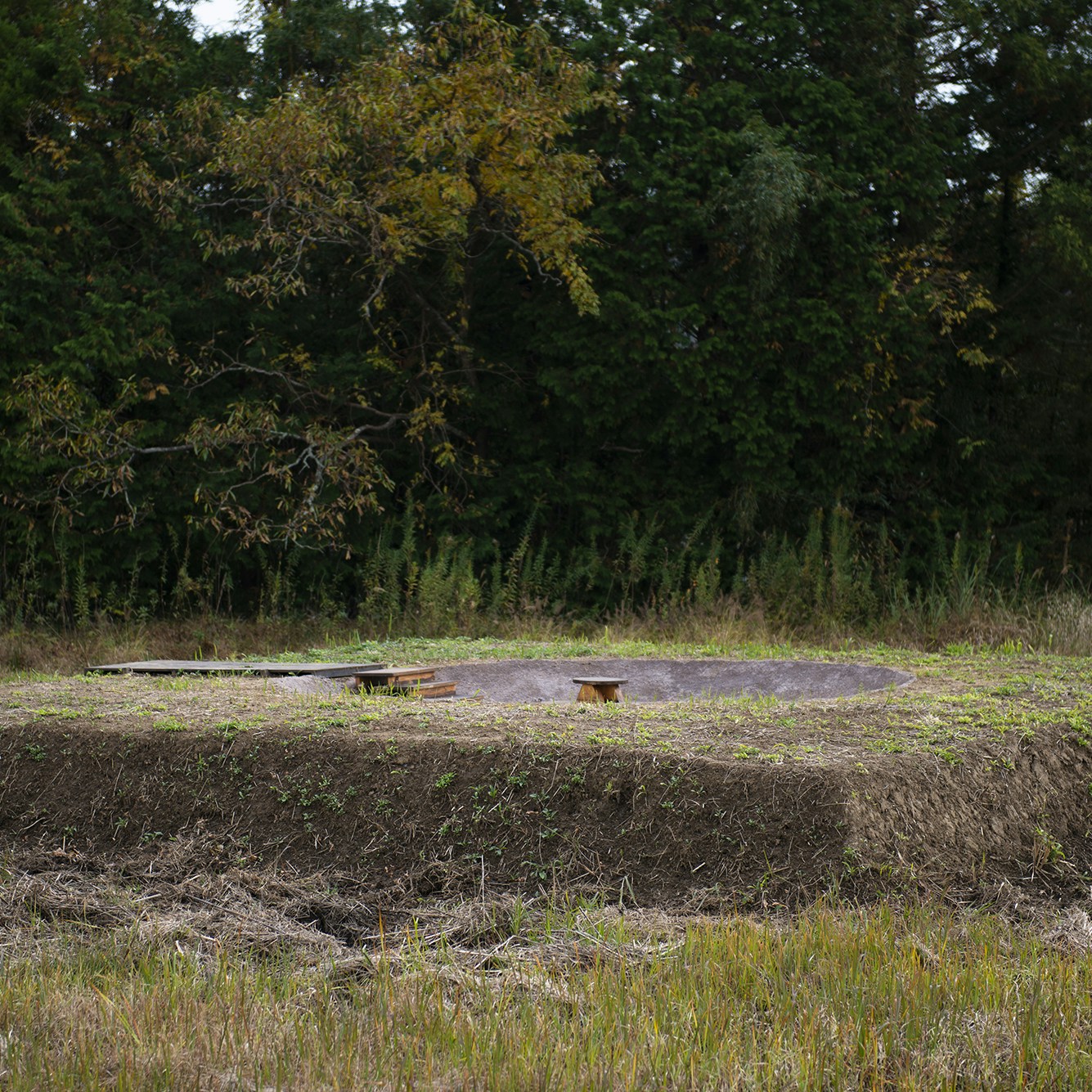 月崎・田淵エリアに移動する。田んぼの真ん中に土俵のような舞台が設置されている。エルモ・フェアメイズのインスタレーション作品《Mirror of Soil》だ。立つ位置、向く角度を色々と試していくと、チューニングが合った瞬間に音の反響が変化して里山の多様な音が聞こえてくる仕掛けになっている。