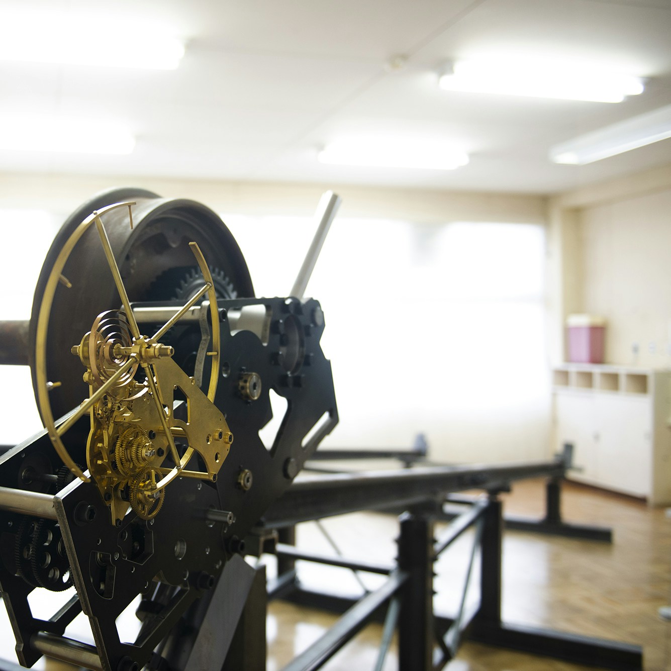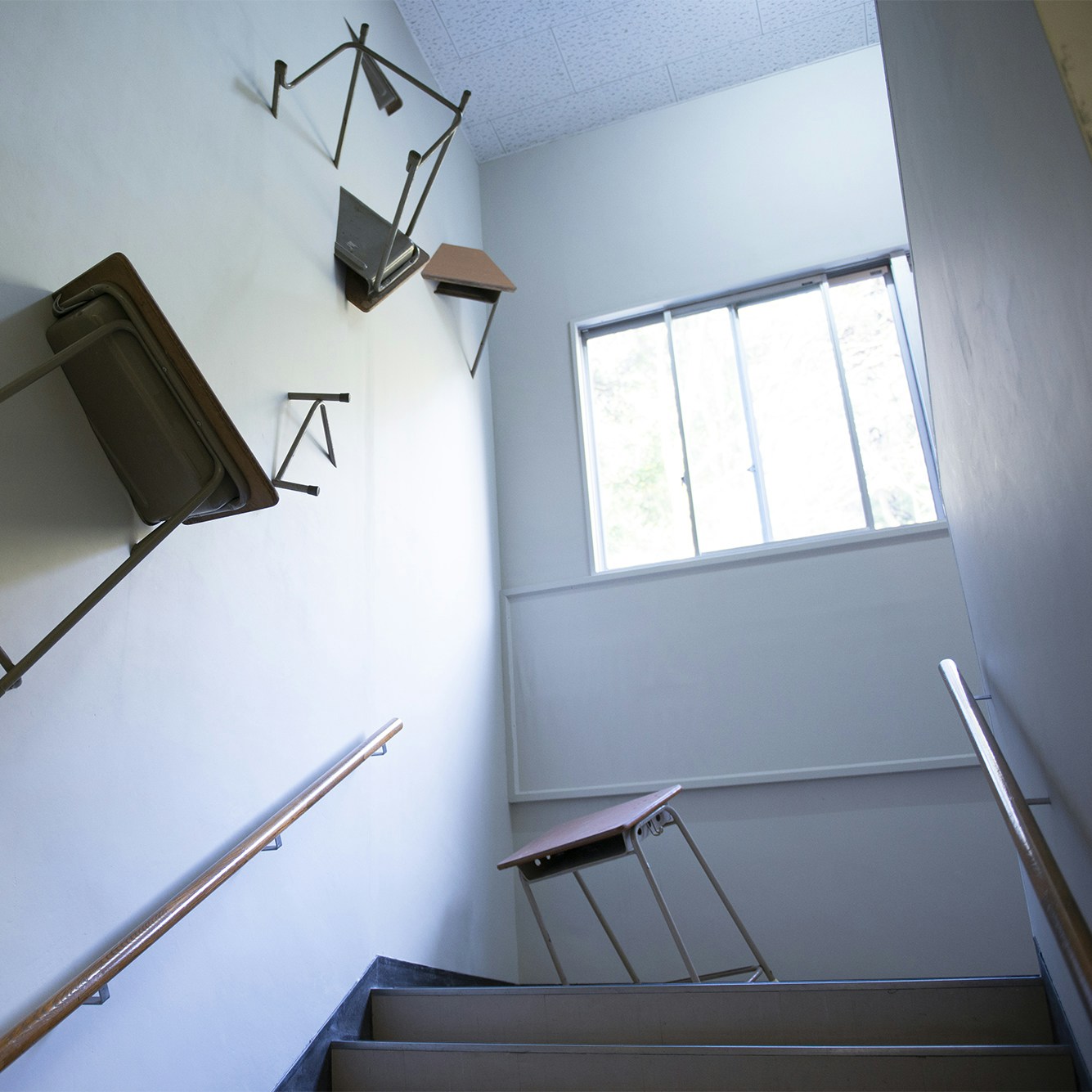 旧平三小学校もまた、12名の作家による作品で彩られている。校舎の階段から屋上へとつながる梯子を題材に「上昇」をテーマにした《ヤコブの梯子(終わらない夢)》と、配膳室のエレベーターで「下降」を表現した《塔(エメラルド・シティに落ちる》を手がけた冨安由真。「誰もが先生、誰もが生徒」をテーマに、市原の歴史や自然、食など、様々なジャンルの講座を実施する開発好明《市原100人教頭学校 キョンキョン》。ゼンマイ時計の仕組みを用い、重い車輪が2ヶ月かけて緩やかな傾斜を降りていく装置を作品化した秋廣誠《時間鉄道》。市原に実在する建物を撮影し、やさしい町のあかりをミニチュアハウスで表現した栗真由美の《ビルズクラウド》など、空間ごとに見応えのある作品が配置されている。