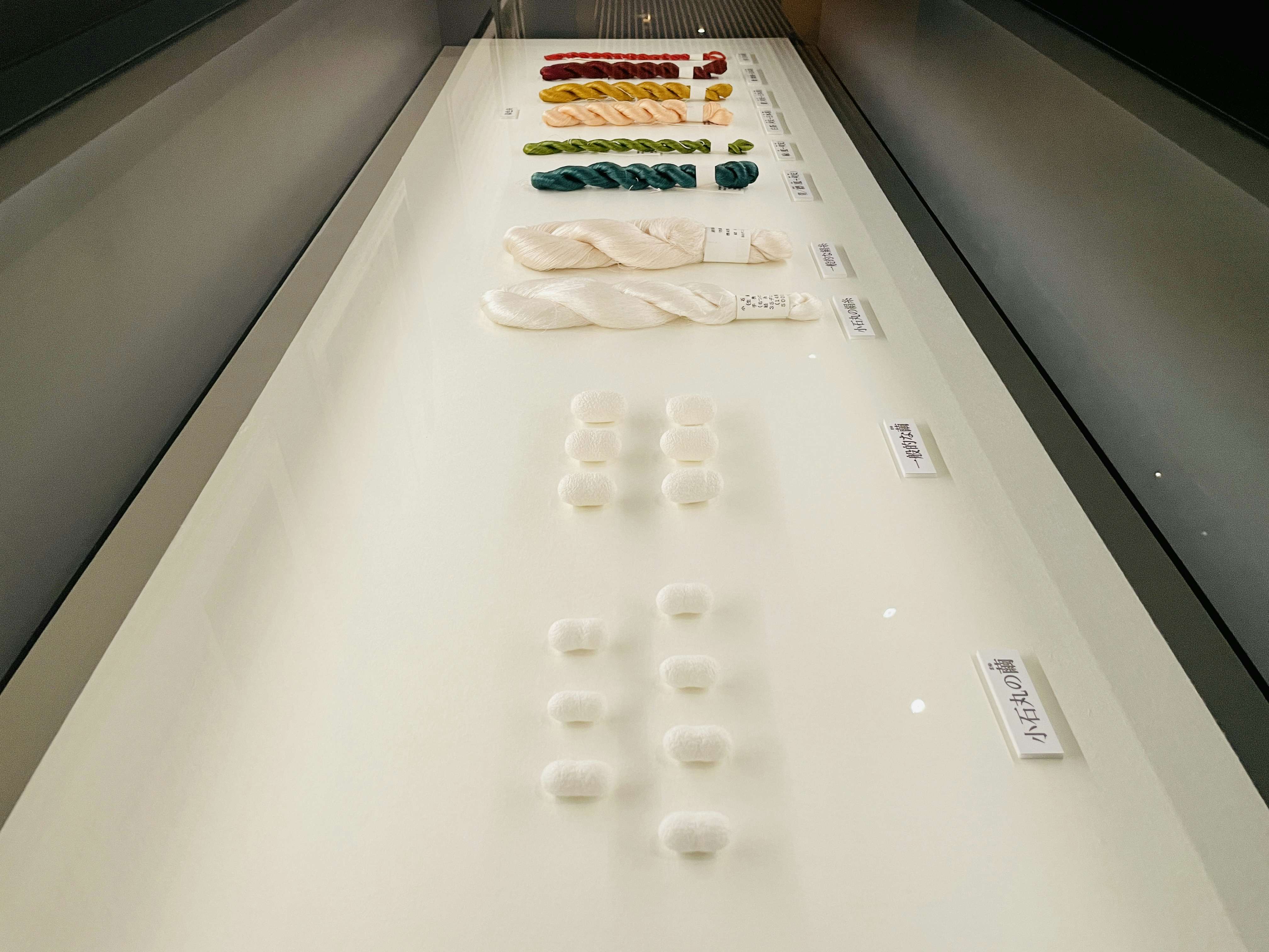 展示風景より、染織品の再現模造に使用された「小石丸」の糸