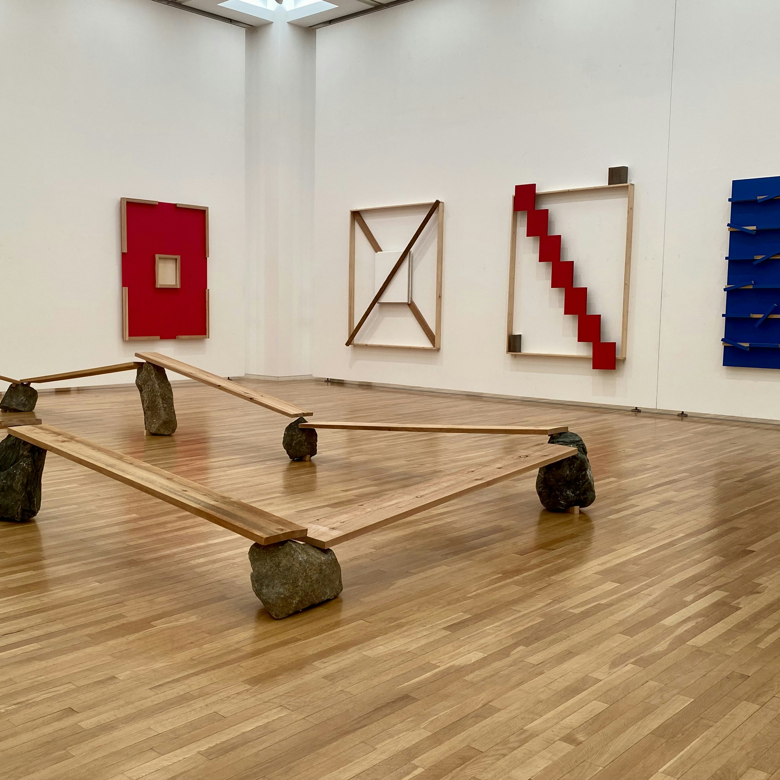 岩手県立美術館での「開館20周年記念 菅木志雄展〈もの〉の存在と〈場〉の永遠」。岩手県盛岡市に生まれ、少年時代は花巻で過ごした菅にとって、故郷での大規模個展となる。総計約120の作品を10年ごとに区分しながら時代順に見せ、これまでの歩みをたどろうとの趣向だ。