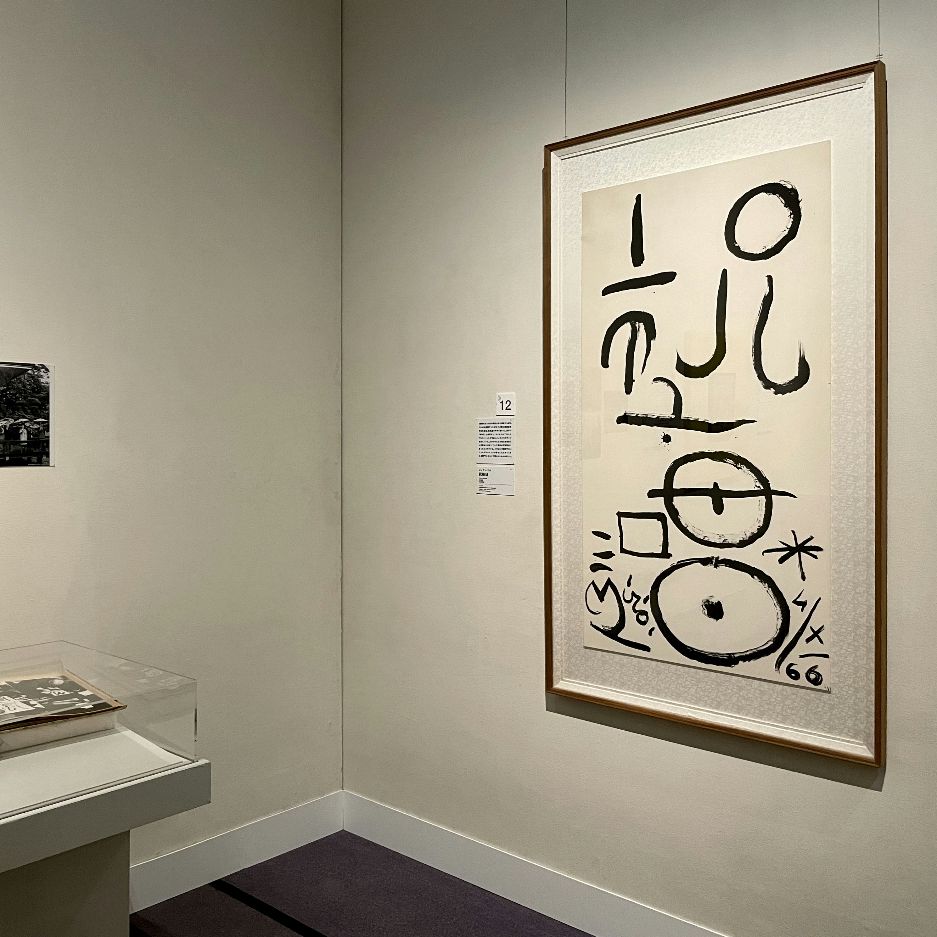 1962年に国立西洋美術館などで開催された日本初の大規模なミロ展「ミロ版画展」に続き、66年に国立近代美術館で回顧展が開催され、その開幕にあわせてミロは念願の初来日を果たした。2週間ほどの滞在中、京都・龍安寺や日本民藝館を訪問した写真資料や、毎日新聞東京本社(パレスサイドビルディング)を訪ね、建物竣工を祝った前衛書道的な作品《祝毎日》(1966)、そして69年に日本万国博覧会のためにふたたび訪日したときの関連資料などが、第5章で見ることができる。