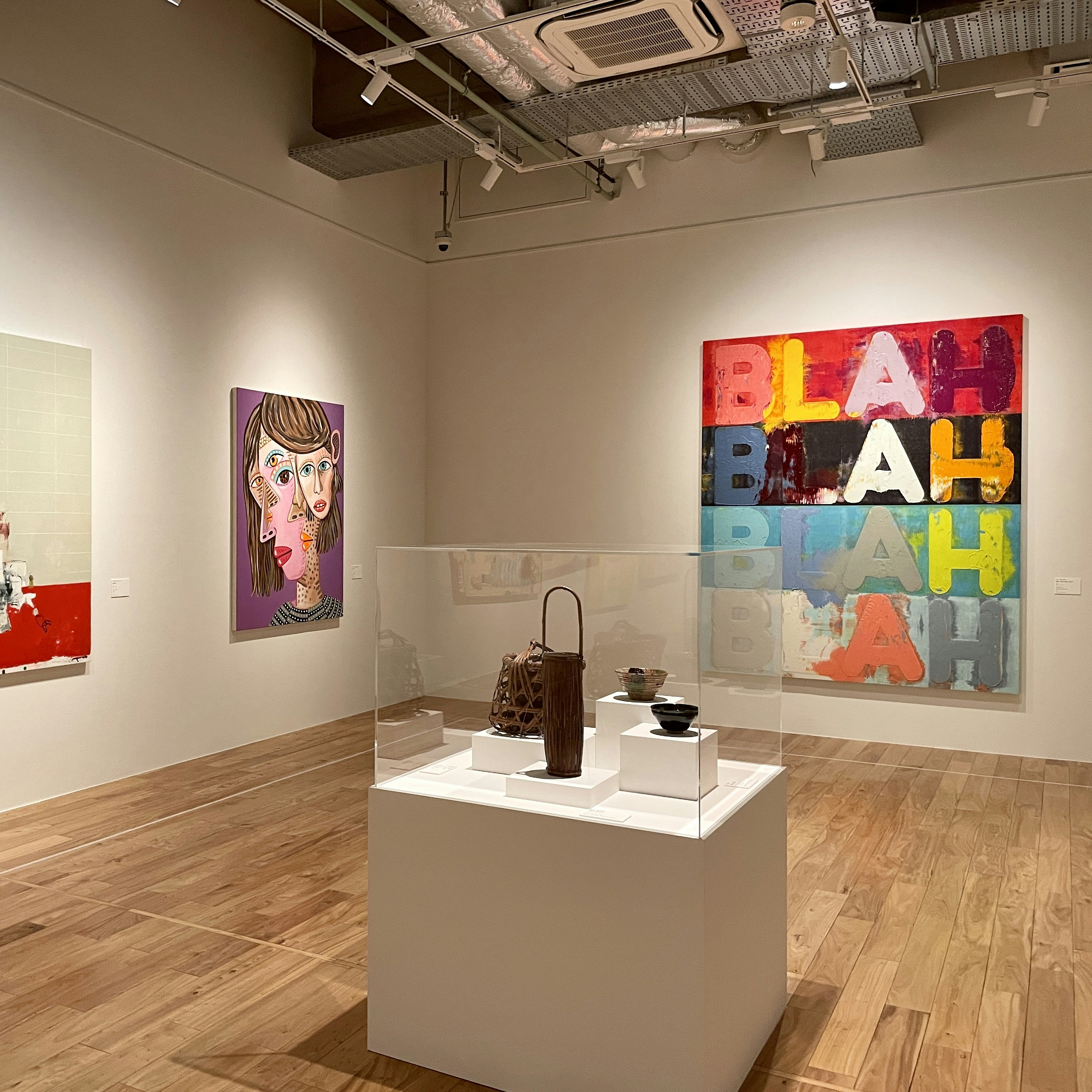 隣のSPACE 3には「カラフル」な作品が集結。展示室の中央には桶谷寧《曜変天目茶碗》や北大路魯山人《椿鉢》などの陶芸作品が展示されており、壁面にはジャン・ジュリアンやハビア・カジェハ、上條晋、メル・ボックナーなどの作品が飾られている。
