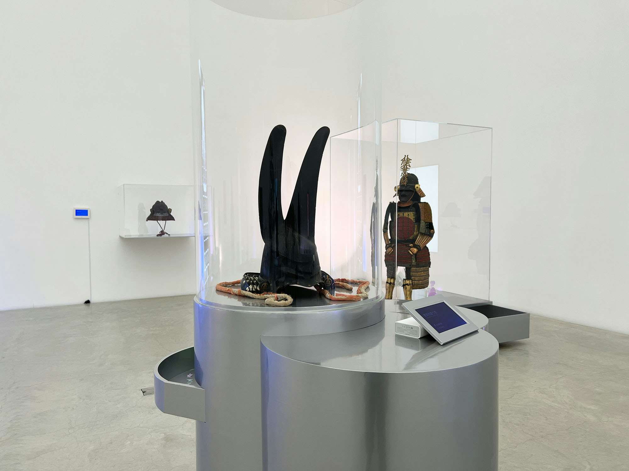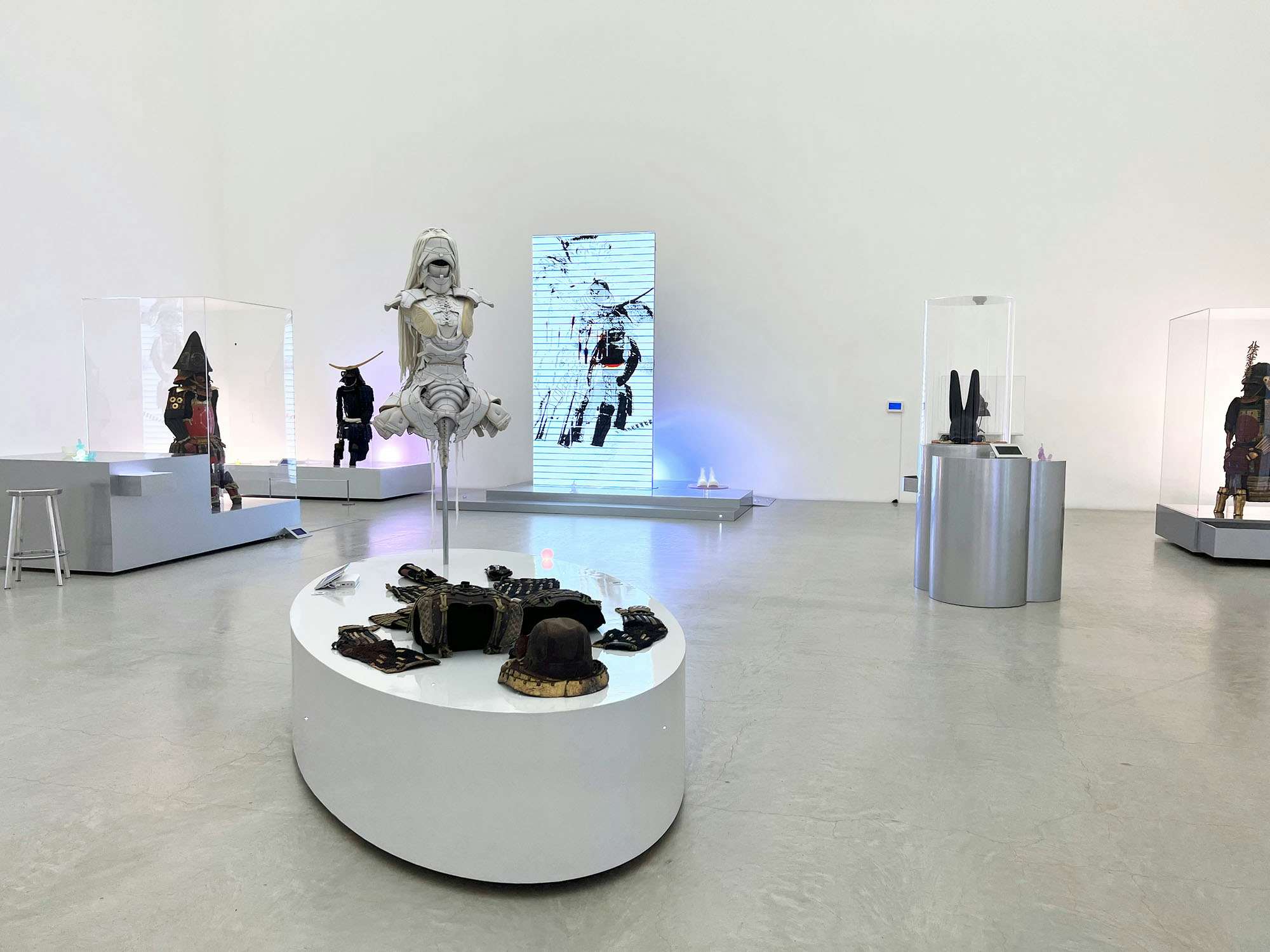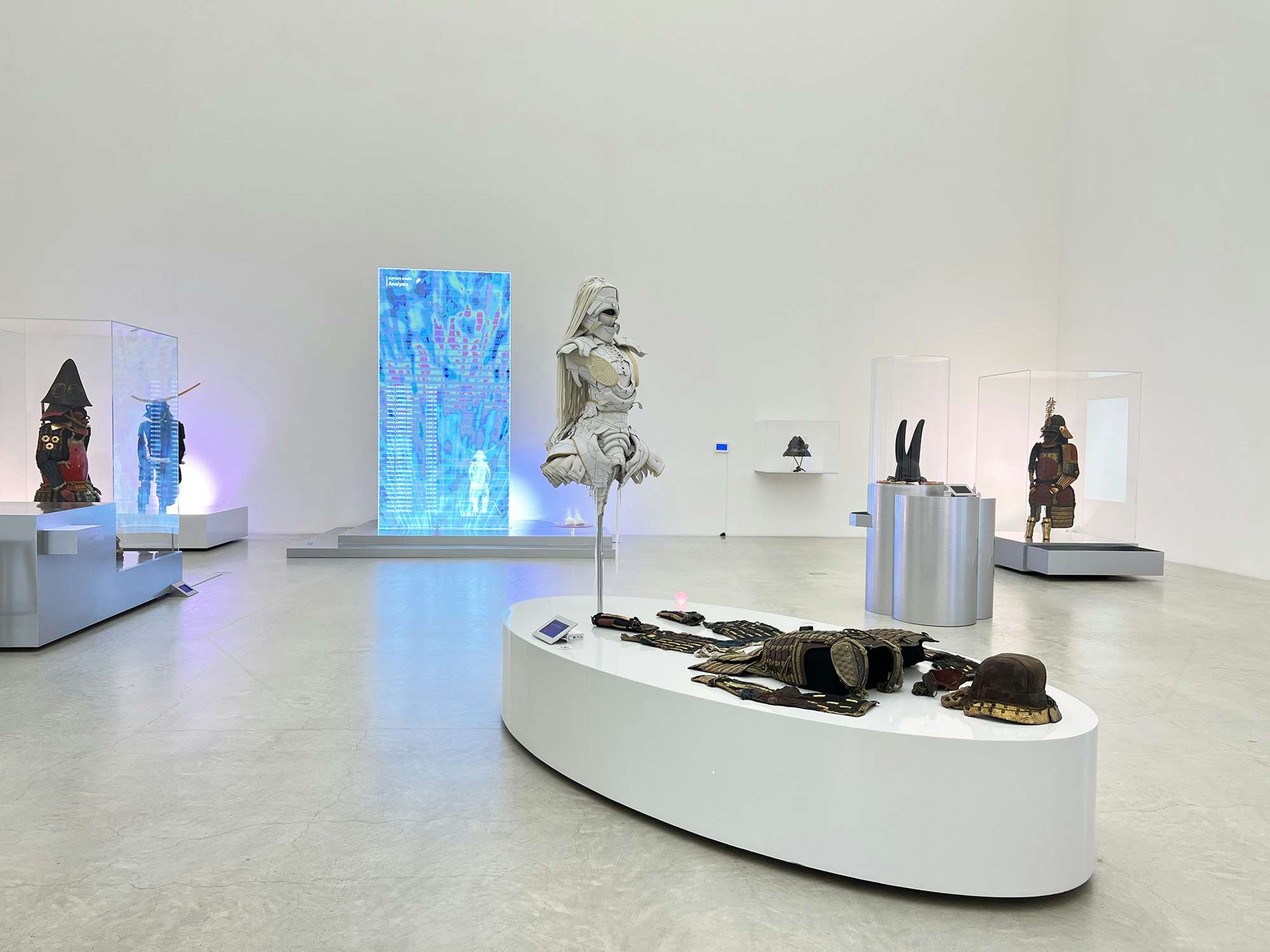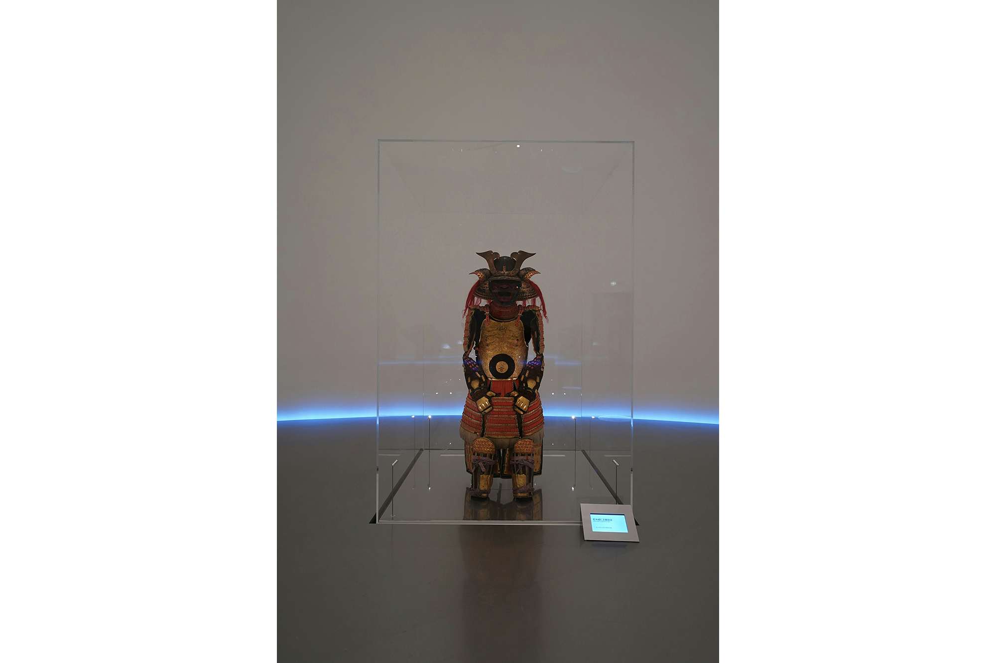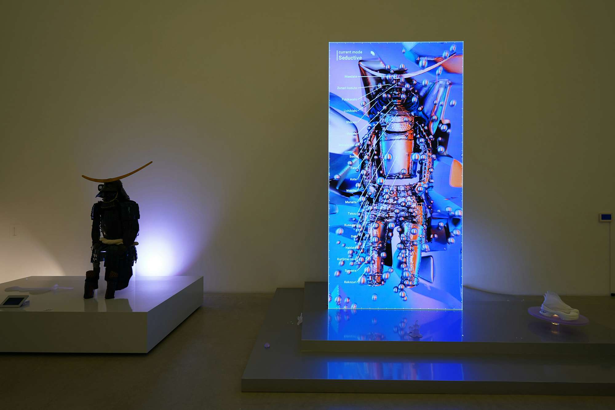 展示風景より、左が《黒漆塗様仙台胴具》(江戸時代、井伊美術館蔵)、右がライゾマティクス《Displayed Kacchu》(2022)