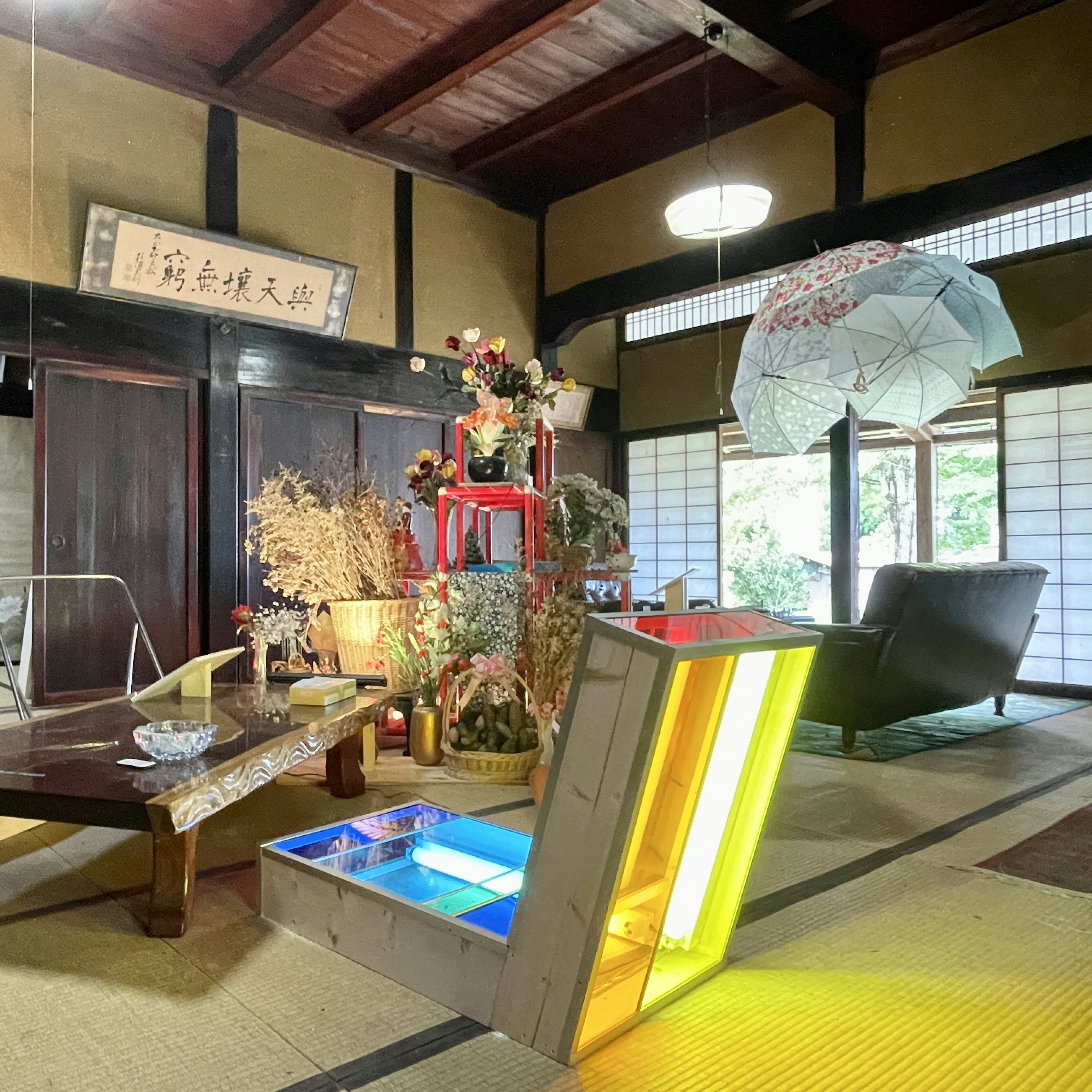 中﨑透は、十日町エリアの新座地区にある三大豪邸のひとつといわれる空き家で「新しい座椅子で過ごす日々にむけてのいくつかの覚書(仮)」というタイトルの作品を発表。長年付き合ってきた座椅子の具合が悪くなり、新しい座椅子を手に入れるという思いと、展示場所である「新座」の関係から構想が生まれた作品だ。空き家の持ち主が収集した様々なものやネオン管による作品が、同地域にまつわる人々のインタビューから引用したテキストとともに展示され、ひとつの物語が織られる。