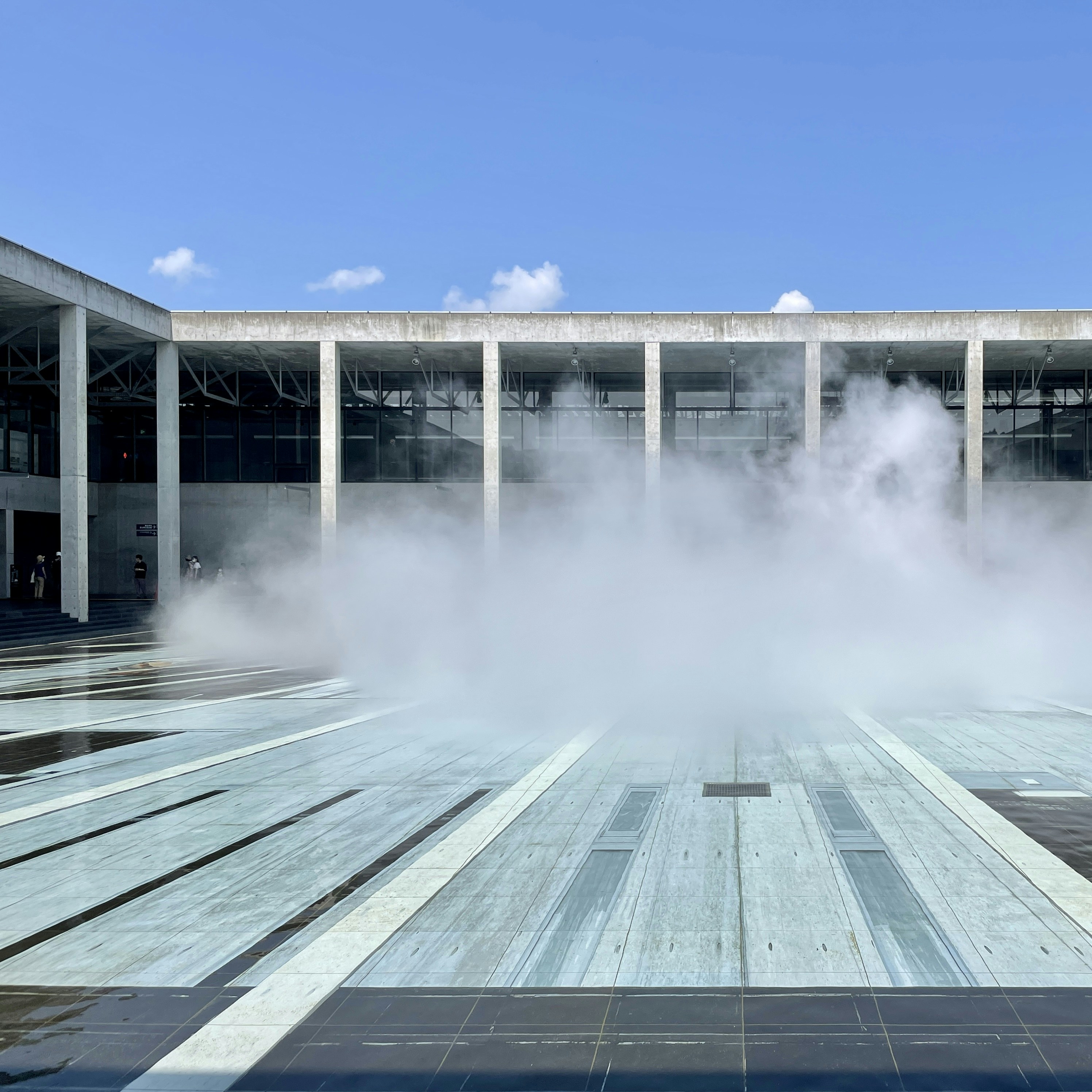 芸術祭の本番ともいえる夏季の新作のなかで、まず注目したいのは中谷芙二子の霧を用いたインスタレーション作品《霧神楽》だ。作品舞台となるのは、レアンドロ・エルリッヒが2018年の芸術祭の際に「越後妻有里山現代美術館[キナーレ]」(現・「越後妻有里山現代美術館 MonET」)で発表した作品《Palimpsest: 空の池》。回廊に囲まれた空と建物が反射する池の水面に、人工的な装置によって発生させた霧による中谷の作品が展示される。また、8月12日〜14日の3日間、同作を舞台とした田中泯によるパフォーマンスが5回にわたって上演される。