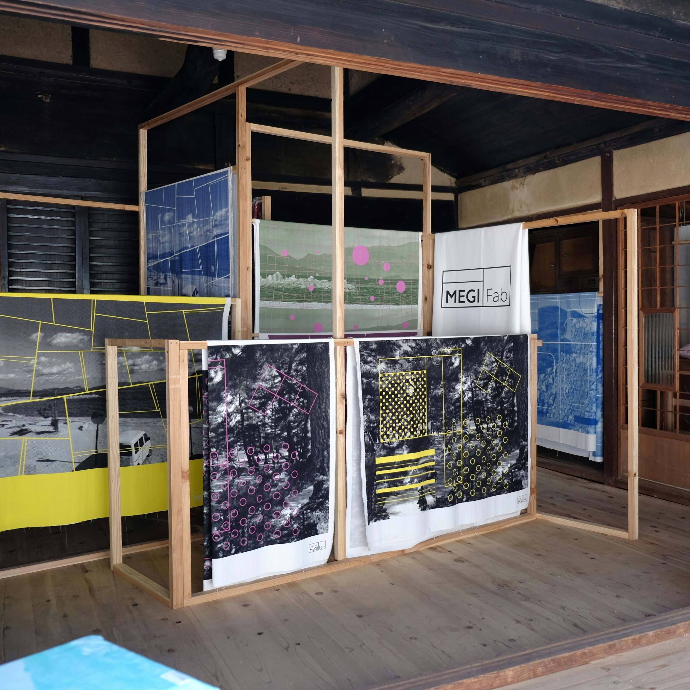 春会期から続いている三田村光土里によるファブリックプロジェクト《MEGI Fab(メギファブ)》(2022〜)。女木島の町並みの写真をプリントした布に、女木島特有の強風から家々を守るためにつくられた石垣「オオテ」のモチーフを組み合わせている。島を訪れた人々がこのファブリックを持ち帰ることで、島の日常を様々な土地で映し出すことができる。