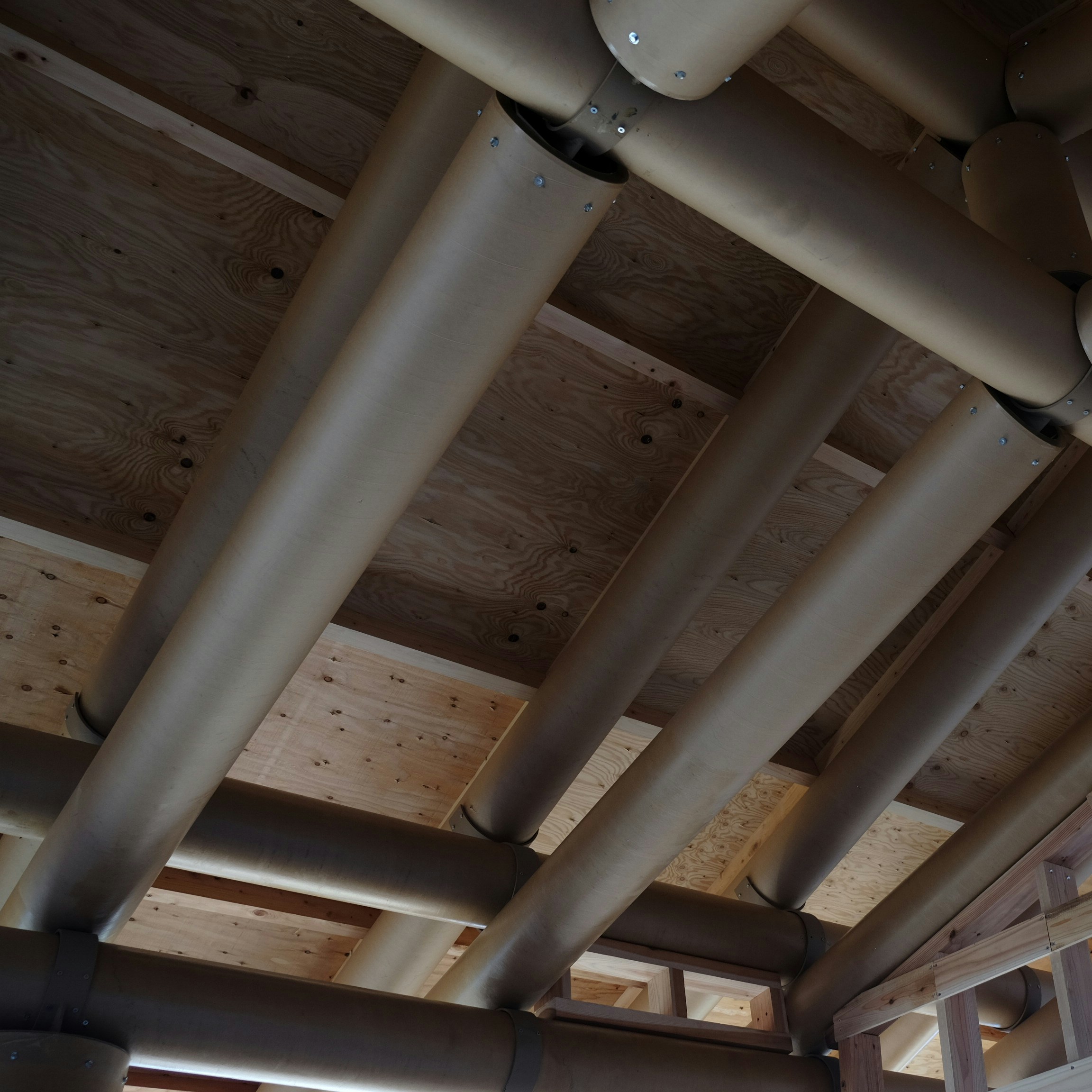 大岩オスカール+坂茂《男木島パビリオン》(2022)は、建築家・坂茂とアーティスト・大岩オスカールの共作だ。見晴らしの良い土地に、坂の設計による柱や梁に紙を多用した家を建て、そこに大岩が風景と一緒になれるような壁紙や、ガラス絵画を作成した。